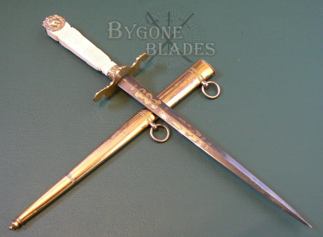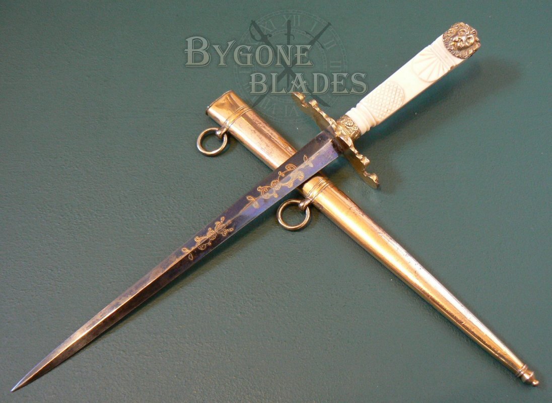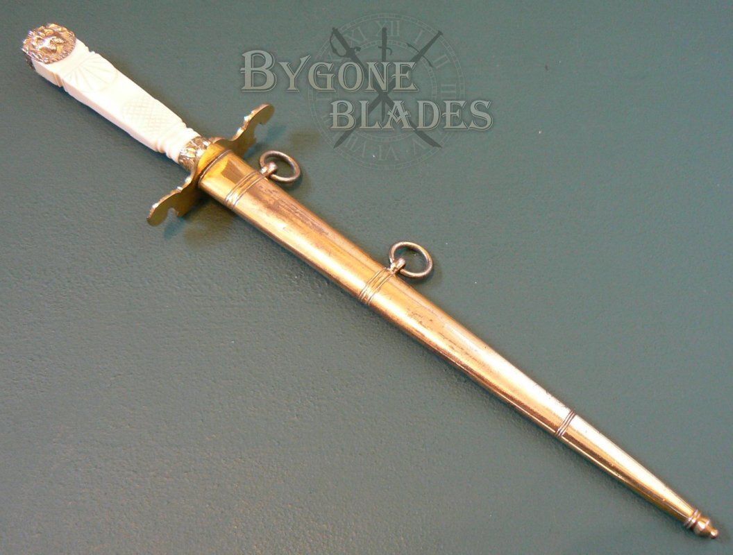 The dirk is complete with its original gilded brass scabbard with two suspension rings, incised bands and a turned finial. The scabbard is lined inside with leather and is in excellent condition. The dirk sheathes and draws smoothly and is held firmly within the scabbard which retains almost all of its gilding with only mild wear.