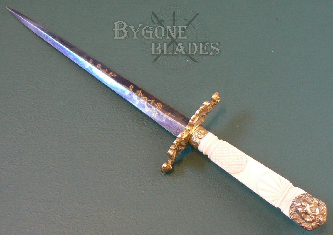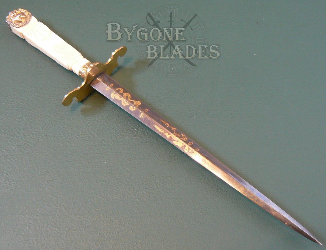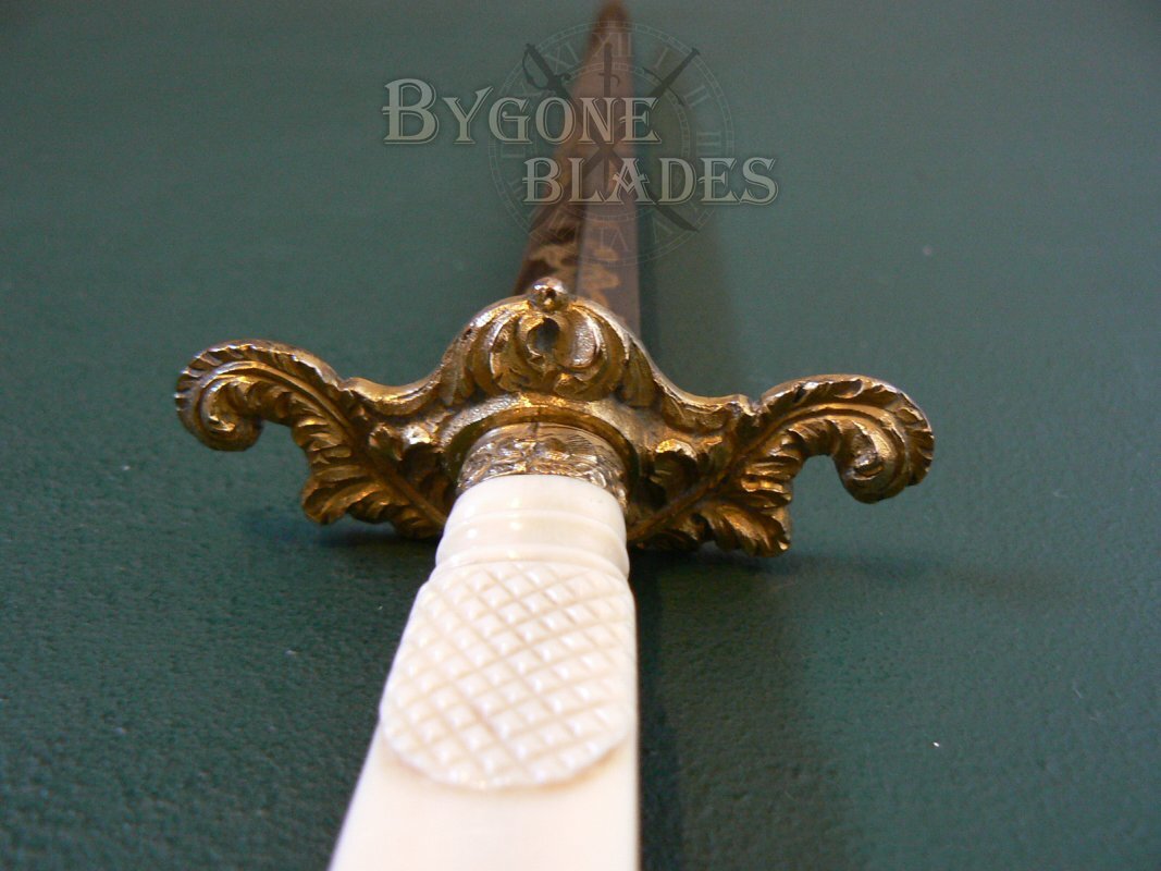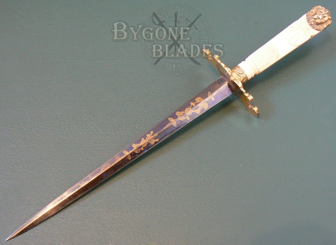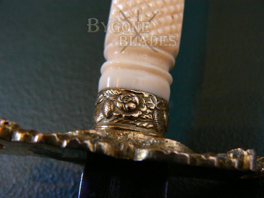The 200mm double-edged blade has a flattened diamond cross section and narrow needle-like spear point. The blade is in excellent condition with almost all of its original blue and gilt finish remaining. The blued blade has gilt floral decoration, differing on each side with what looks to be the stylised initials “S. O.” on the facing forte.
