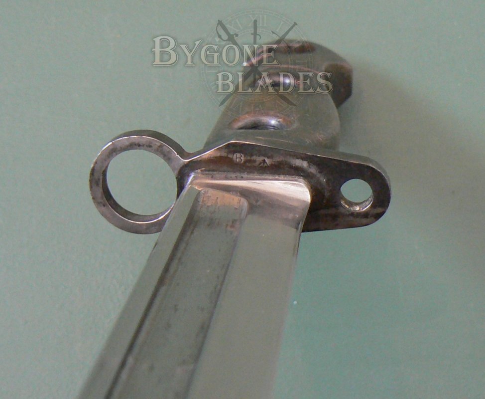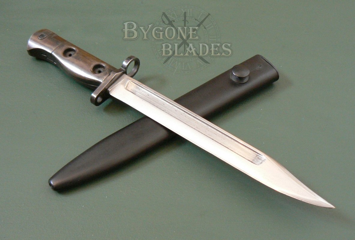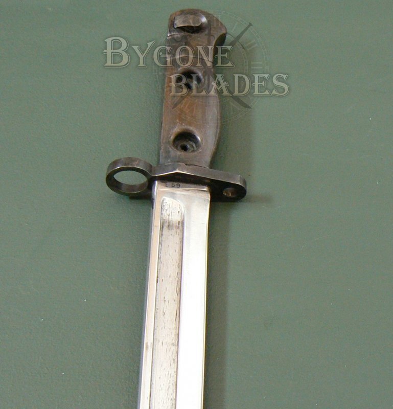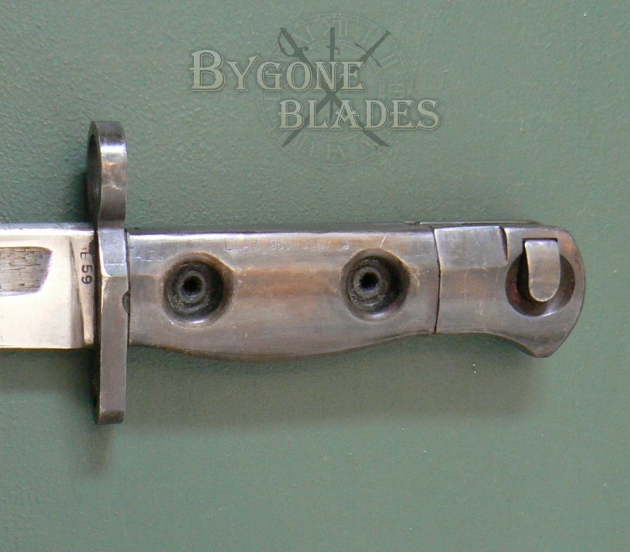 The 20cm single edged blade has a rounded spine and a sharpened clip point. This blade has the scarce, original long fuller. The ricasso is stamped with “B59” for the place and date of manufacture and the early waisted crosspiece bears the British broad arrow and the letter B.