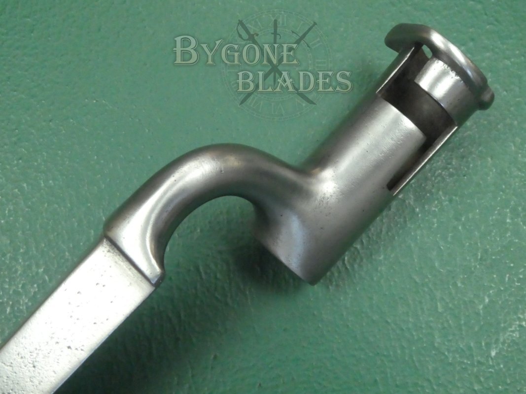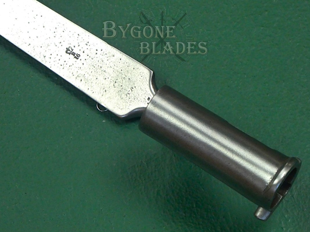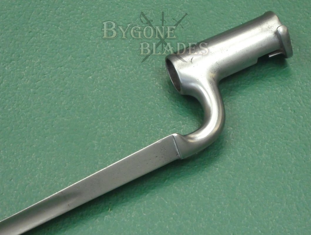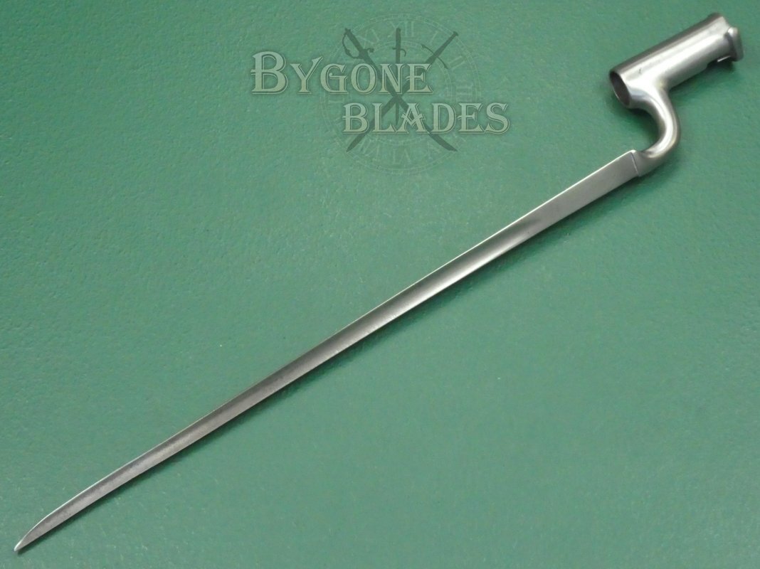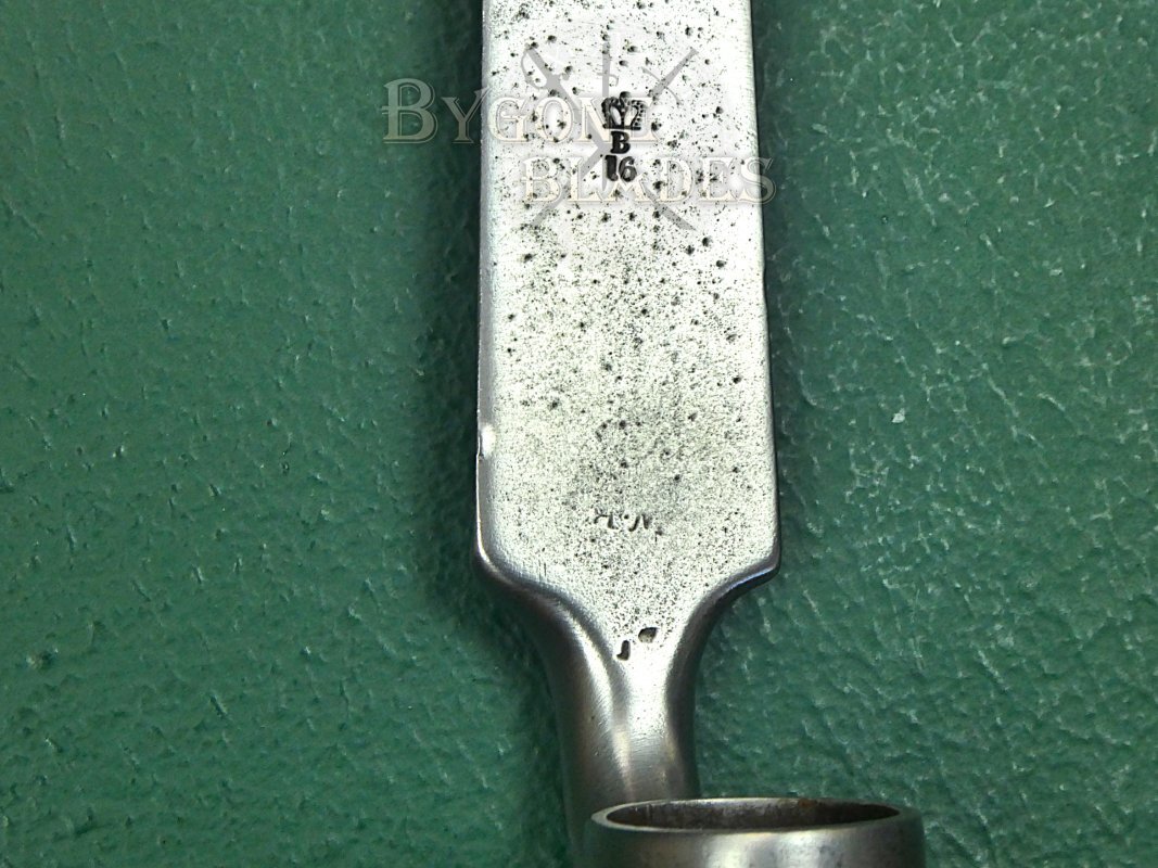 This 1851 pattern bayonet has an overall length of 528mm. The socket is 76mm in length with a muzzle diameter of 22.8mm. The blade is 427mm long. The triangular blade has twin fullers on the underside and a flat, un-fullered face. The base of the blade bears the remnants of a maker’s mark and the forte is deeply stamped with a Birmingham inspection mark.