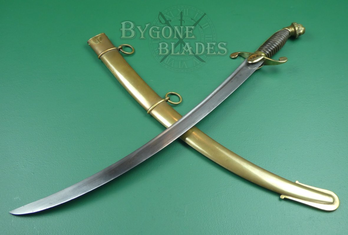 This rare naval midshipman’s hanger dates to around 1820-1840 and is in effect a throwback to the pre-cutlass days of the Royal Navy. The period from which this hanger dates was a time of much change and uncertainty amongst manufacturers, with several new patterns of cutlass being proposed as replacements for the 1804 double disk pattern. These patterns were often accepted by the Board of ordnance and then summarily rejected as soon as an alternative pattern was suggested. All before the manufacturers were able to produce any. Finally, in the early 1840’s a new pattern of naval cutlass was proposed and accepted. This cutlass went into production and is today recognised as the pattern 1845 naval cutlass. During this time of uncertainty, two Birmingham cutlers are known to have produced a small number of curved hangers conforming to the pattern of this example. These cutlers were J & R Mole and James Boydell, trading as the Oak Farm Company. It is unclear as to whether hangers of this pattern were produced as examples for the Board of ordnance and Admiralty or whether they were intended for private purchase by merchant sailors.
