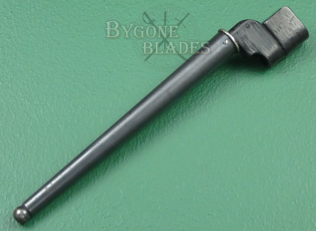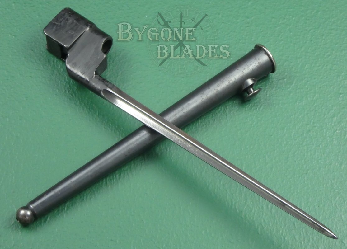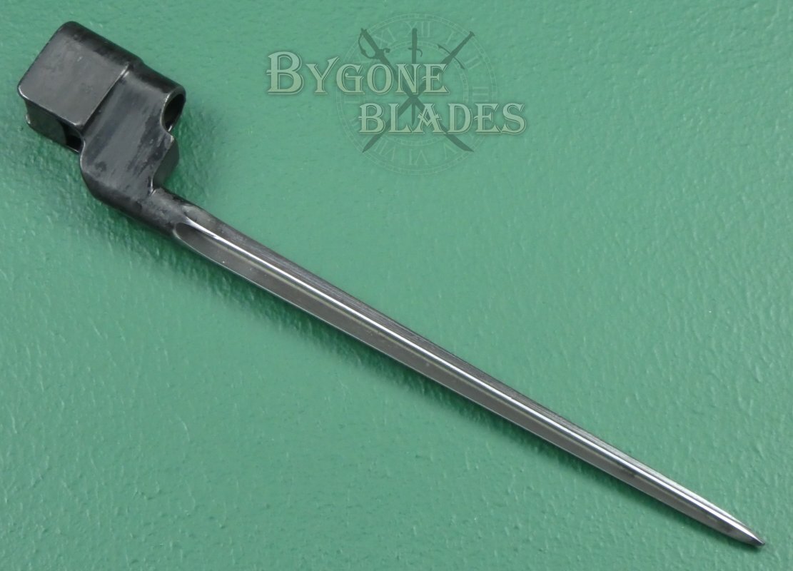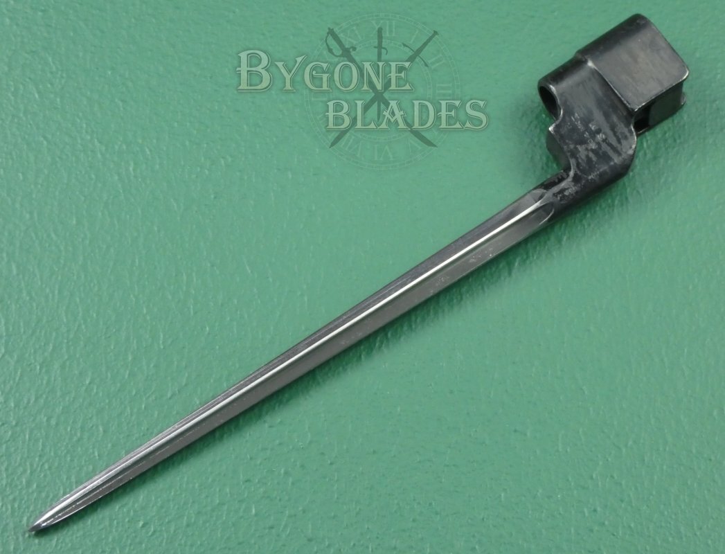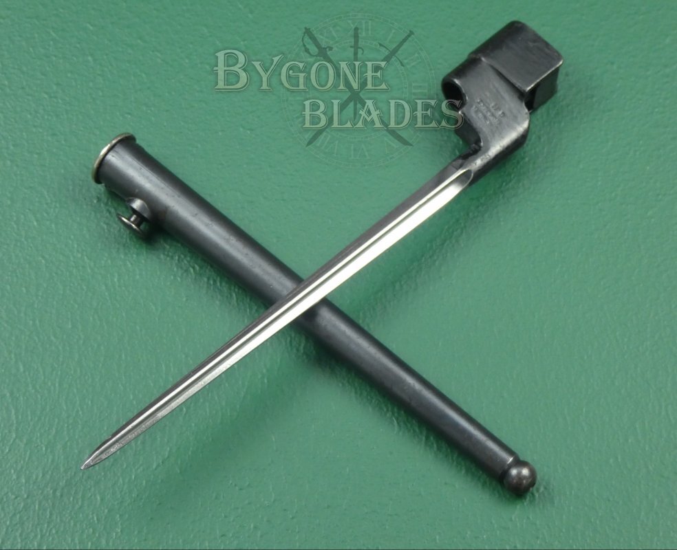 Original British No.4 Mk I cruciform bayonet for the Lee-Enfield No.4 Mk I Rifle. The No.4 Mk1 bayonet was only produced from late 1941 and into the early months of 1942. The sole maker was the Singer Manufacturing Co., at their Clydebank plant near Glasgow, Scotland.
