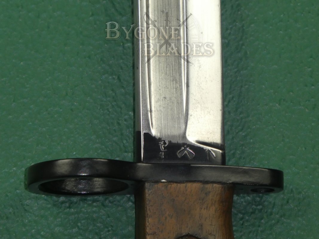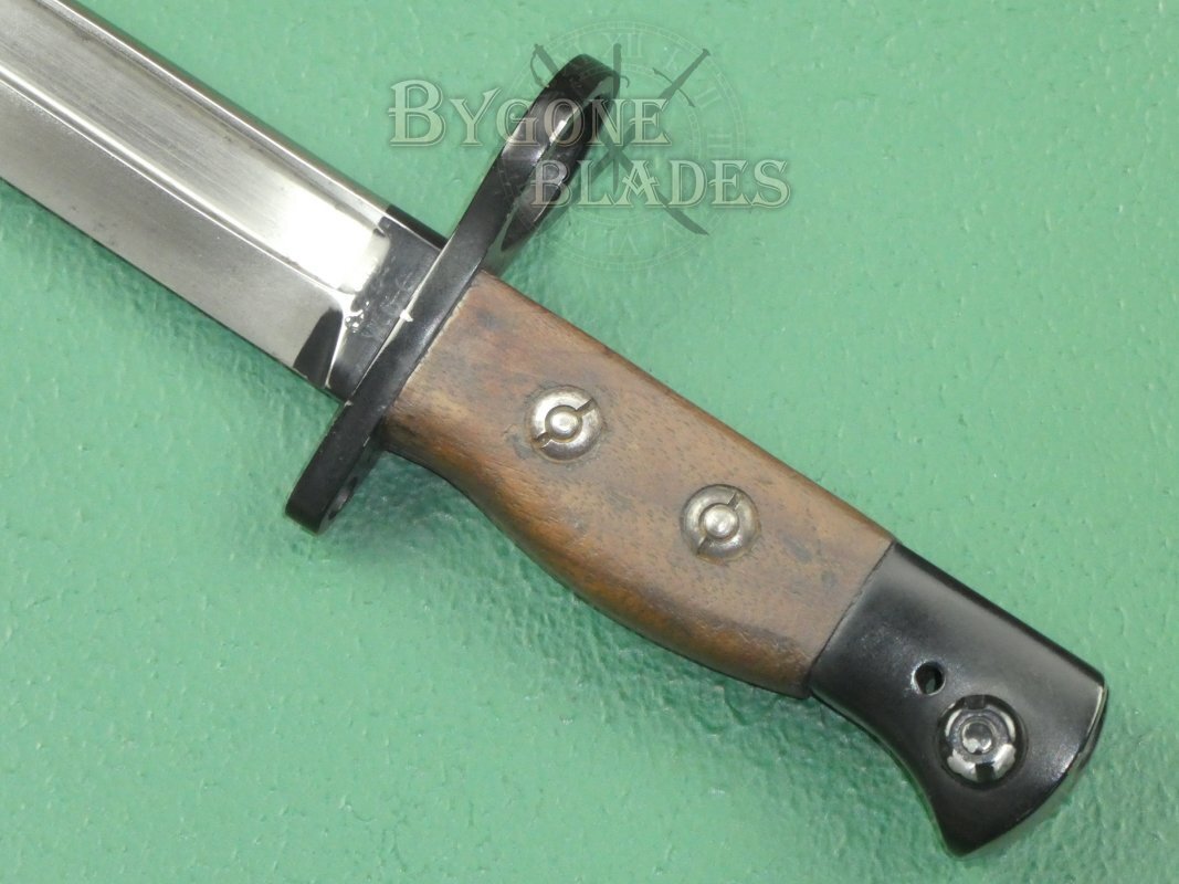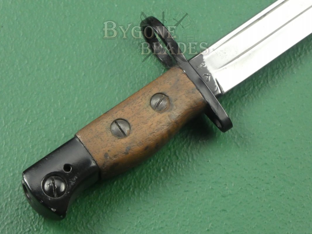 This bayonet was made by the Wilkinson Sword Company and bears their wartime dispersal code S294.