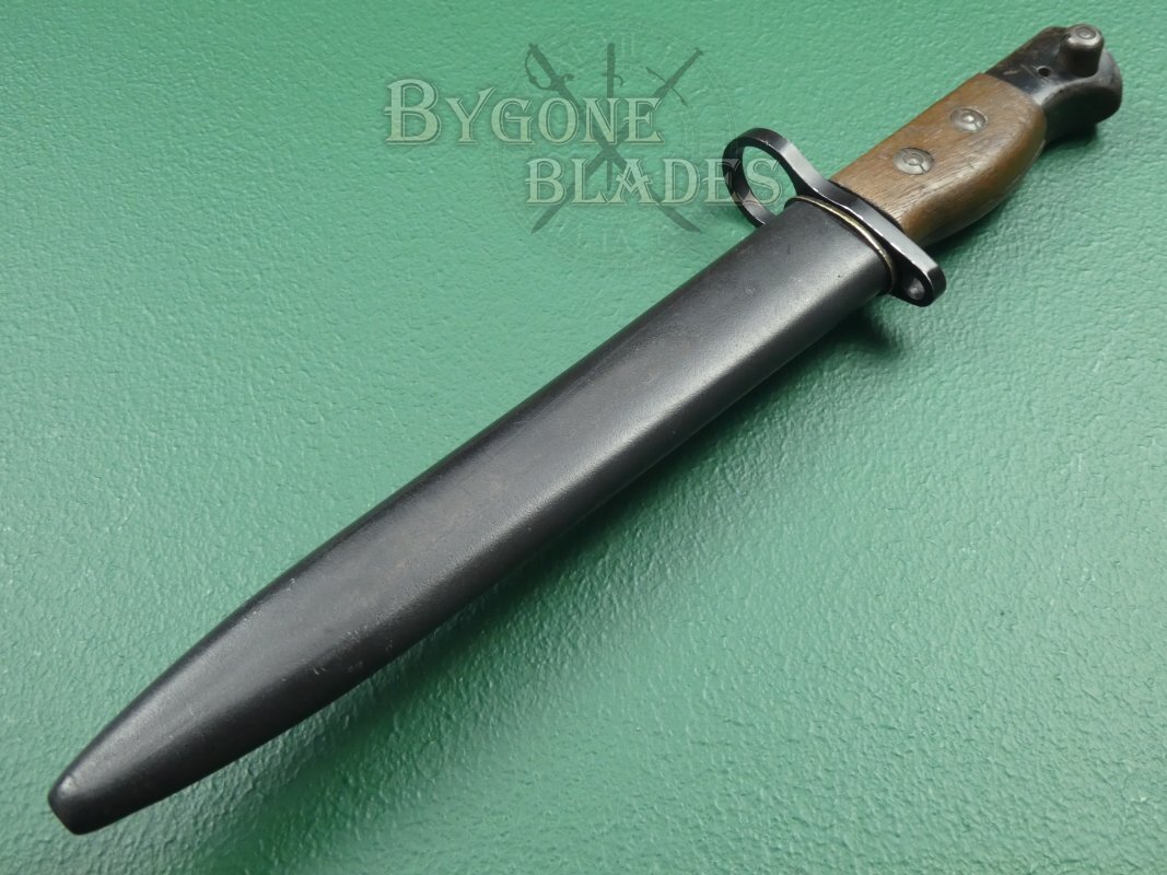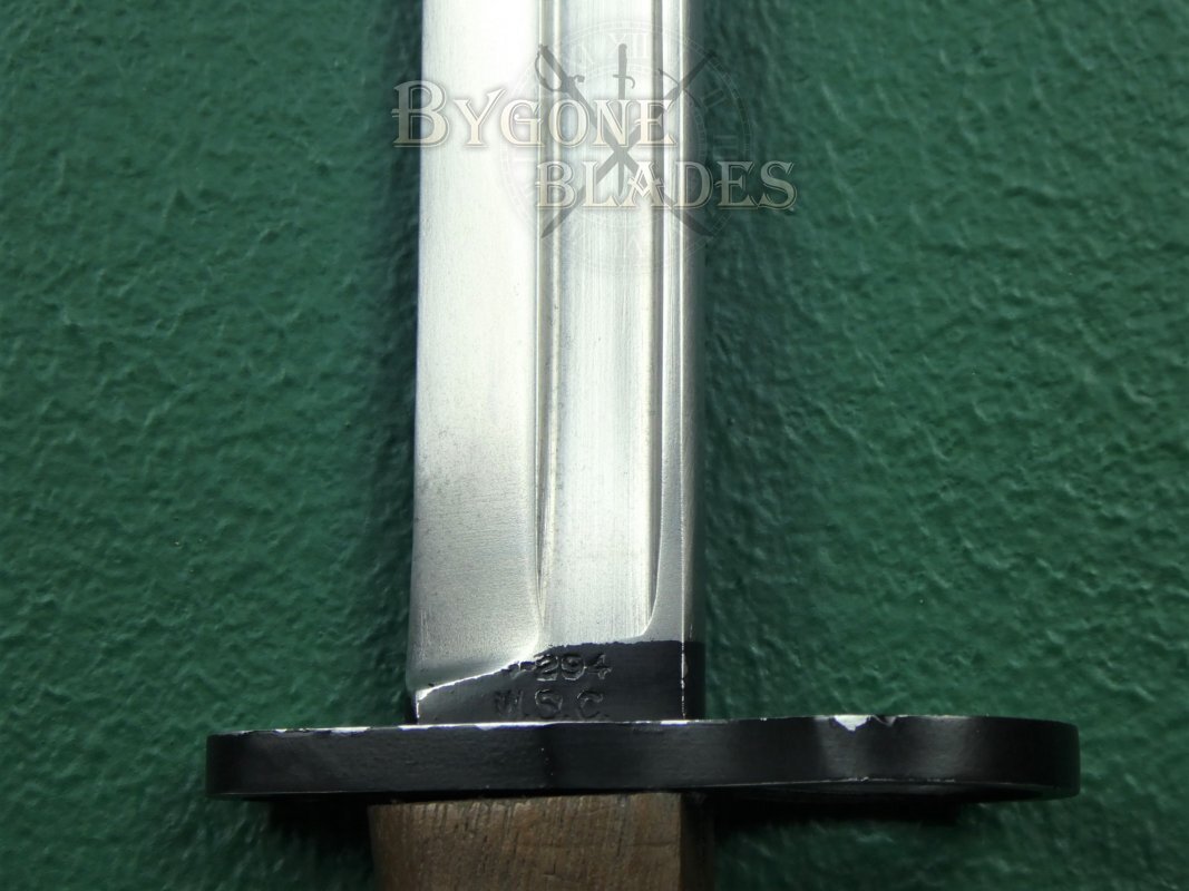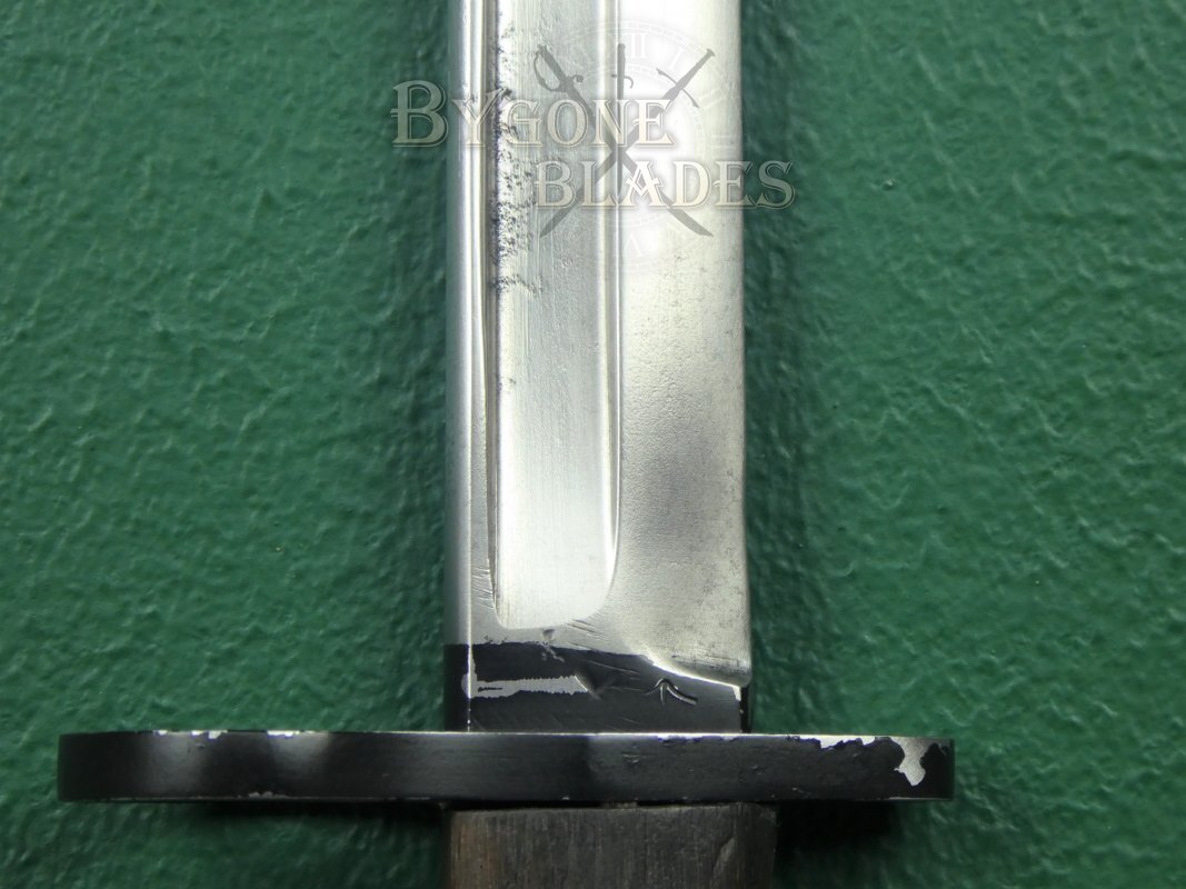 The bayonet is complete with its original MkII scabbard. The scabbard retains its original black finish and the bayonet sheathes and draws smoothly and is held firmly.