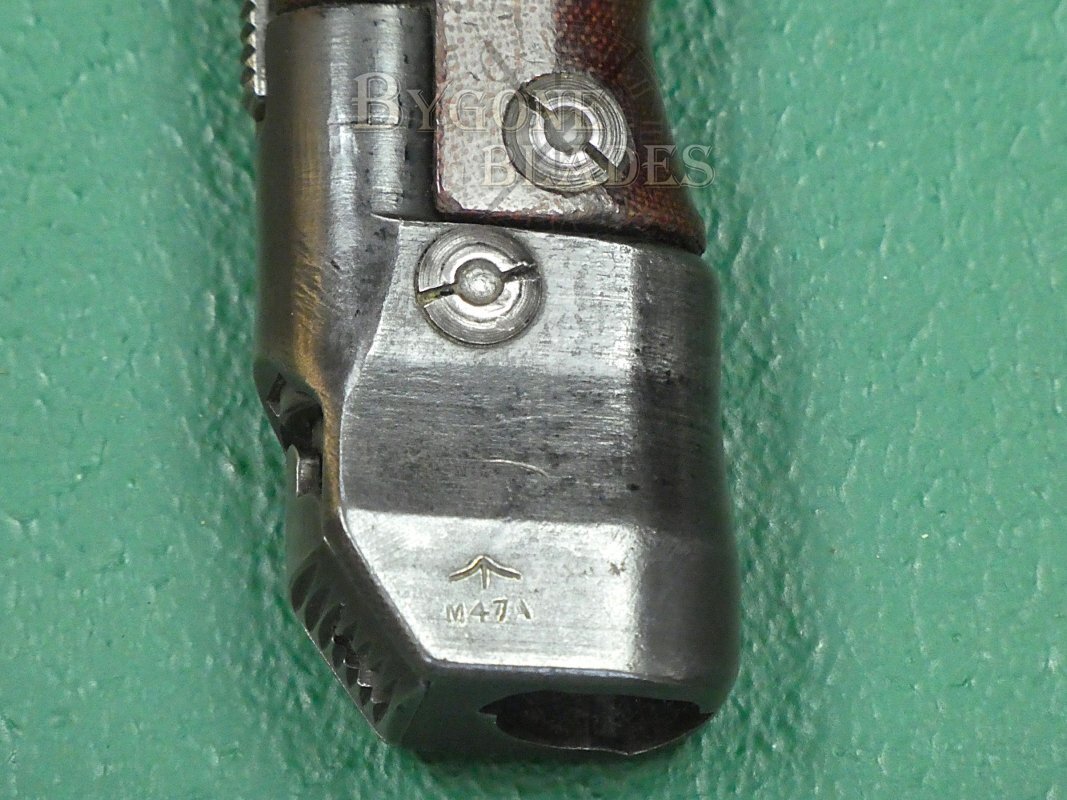 The 207mm clip point blade has a deep single fuller on both sides, is in excellent condition, retaining its original polished finish. The ricasso is stamped with the bayonet’s designation “No.7 Mk 1/L.” The obverse ricasso bears the BSA wartime dispersal code, M47A.
