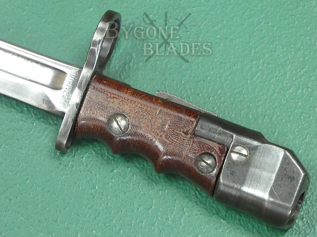These scarce bayonets were made for use with the Sten Mk V sub machine gun. Originally, they were also intended for the Lee Enfield No.4 rifle but after incidents involving rounds hitting the muzzle ring they were only issued with this rifle for parade purposes.