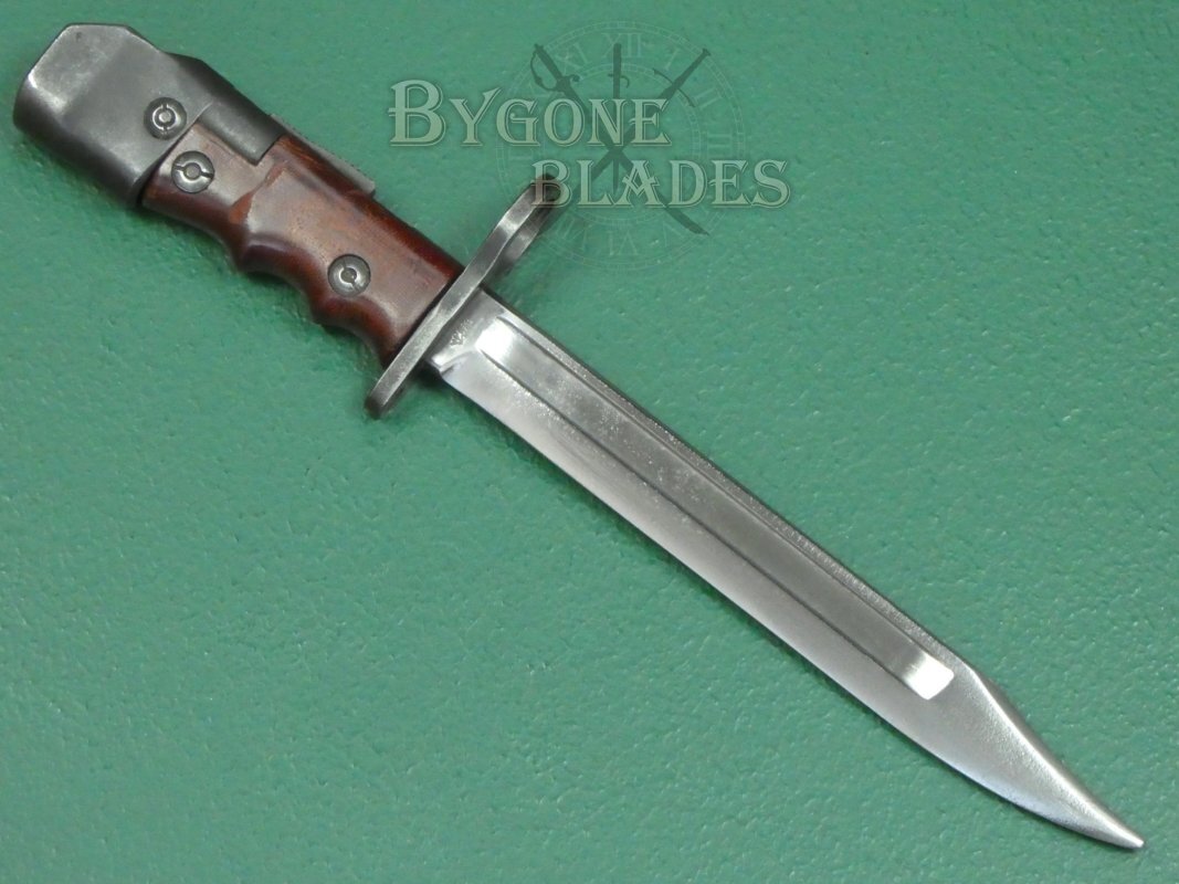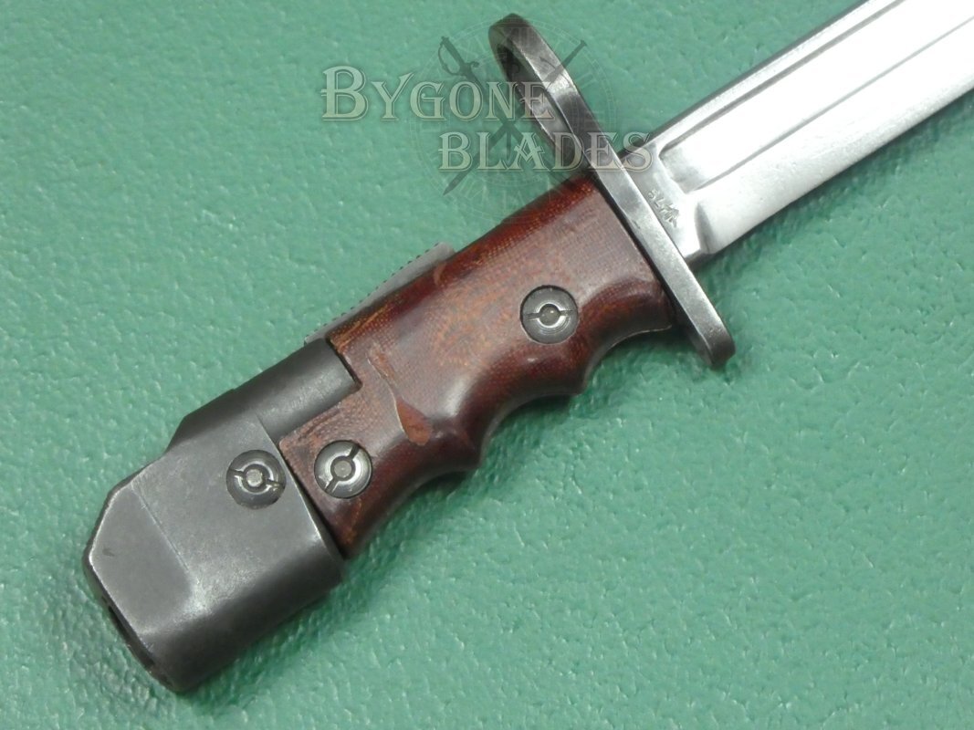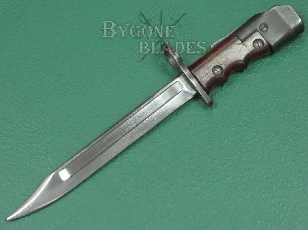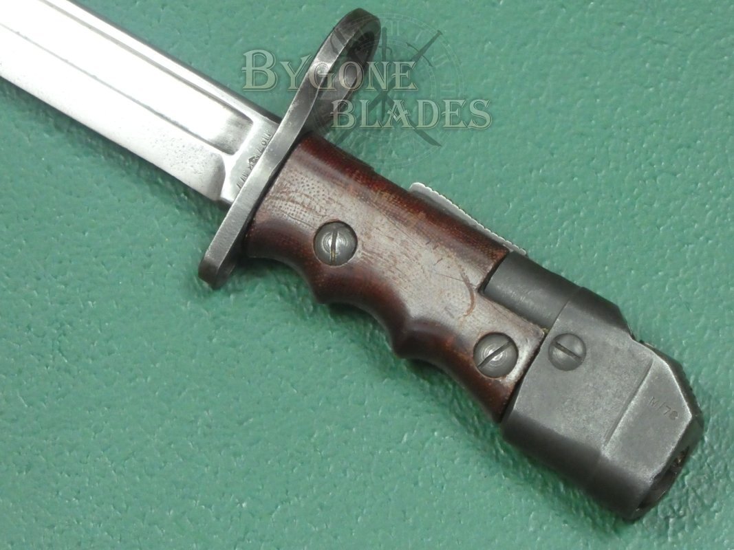 These scarce bayonets were made for use with the Sten Mk V sub machine gun. Originally, they were also intended for the Lee Enfield No.4 rifle but were only issued with this rifle for parade purposes due to incidents involving rounds hitting the muzzle ring.