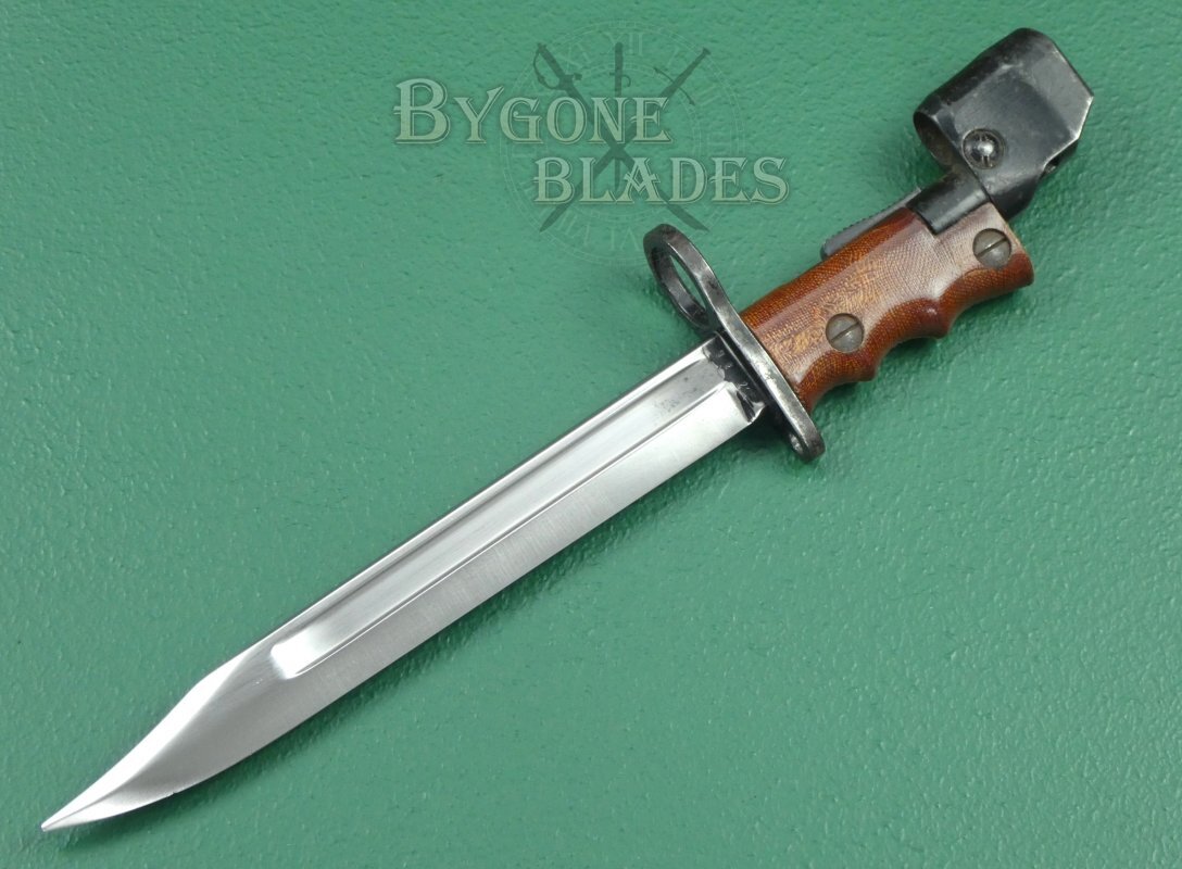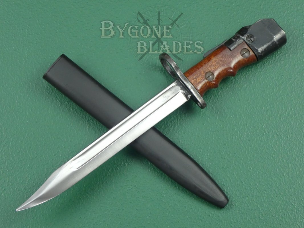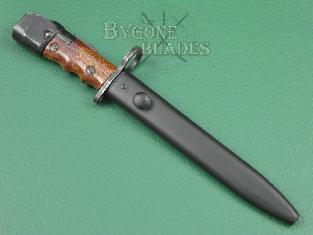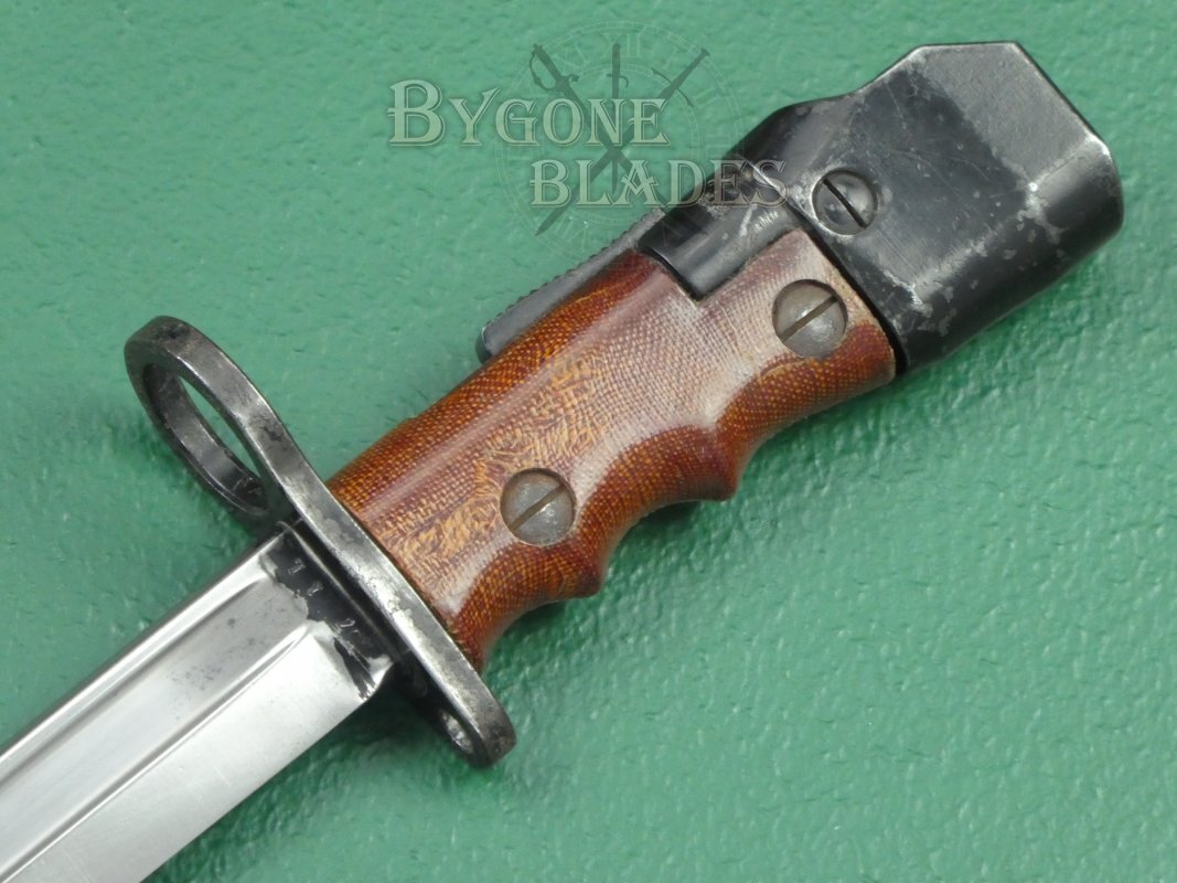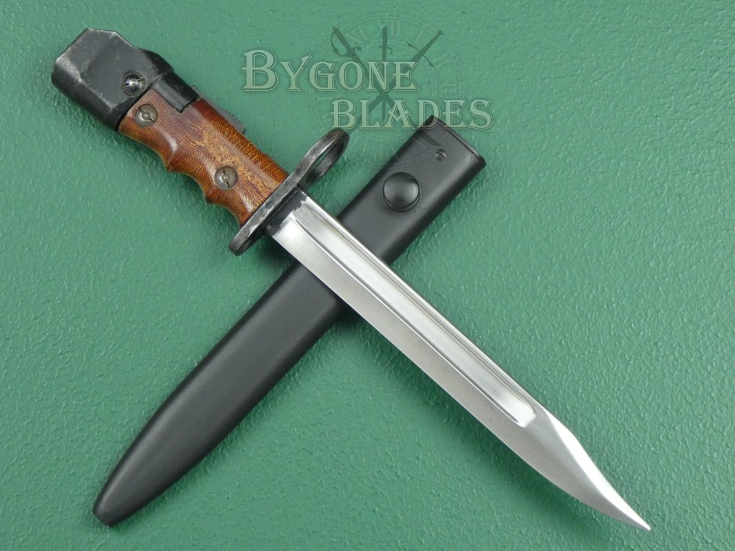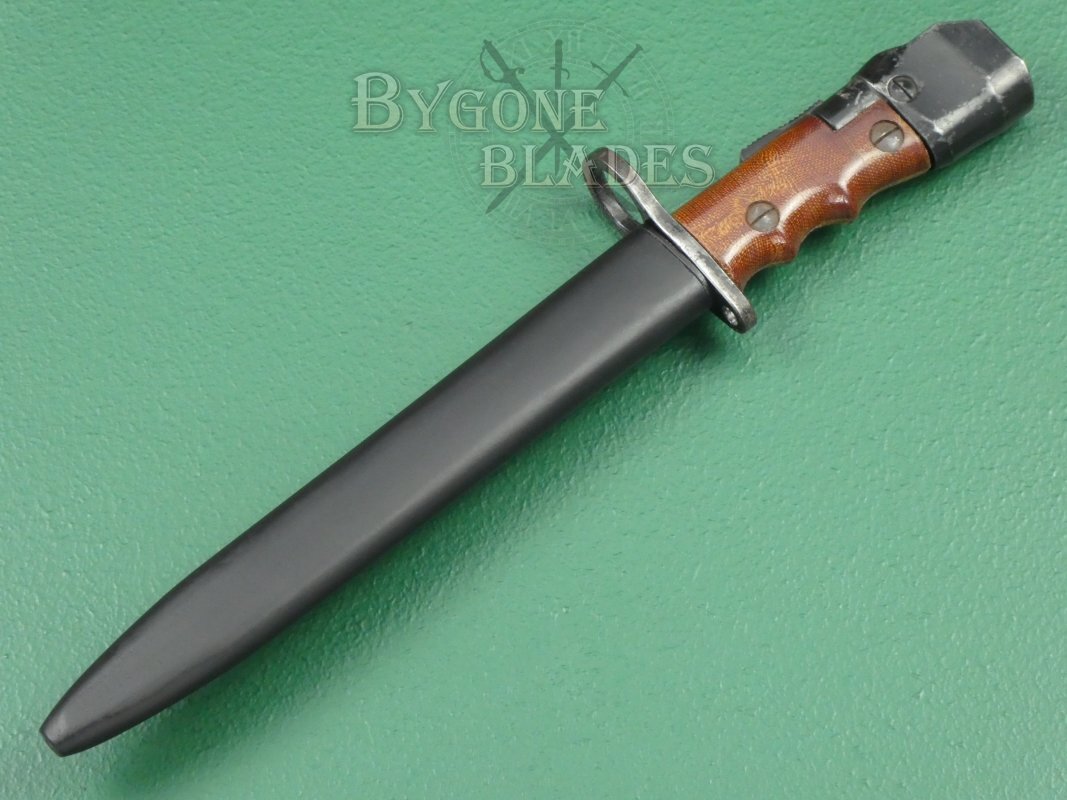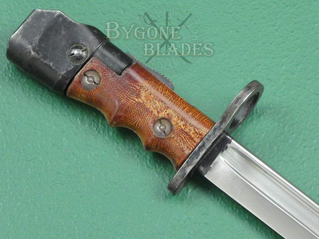 These scarce bayonets were made for use with the Sten Mk V sub machine gun. Originally, they were also intended for the Lee Enfield No.4 rifle but after incidents involving rounds hitting the muzzle ring were only issued with this rifle for parade purposes.