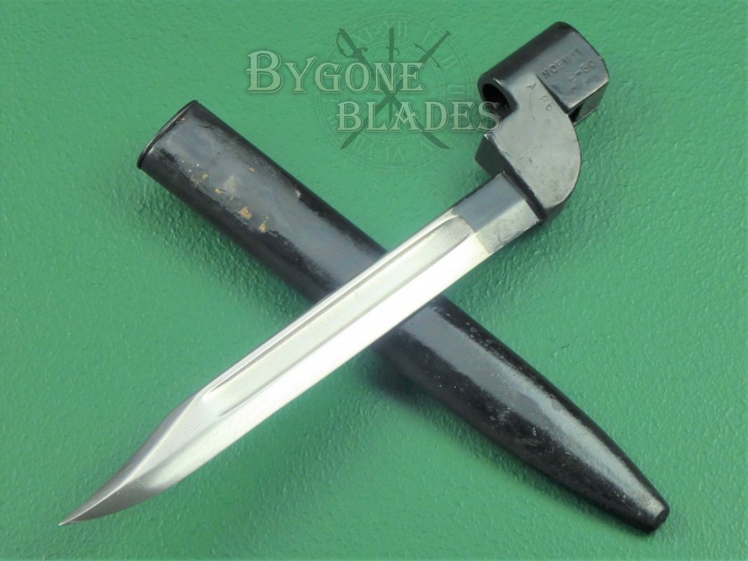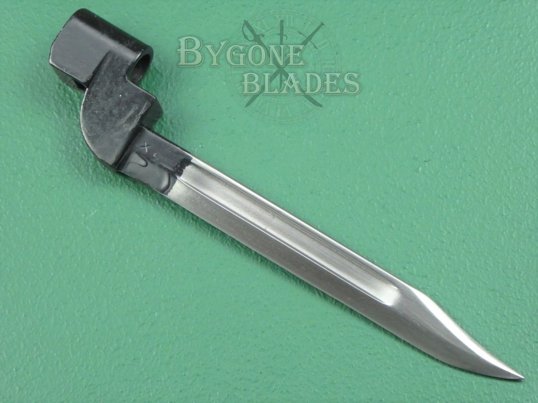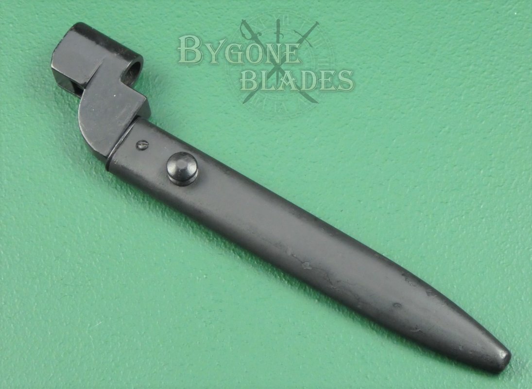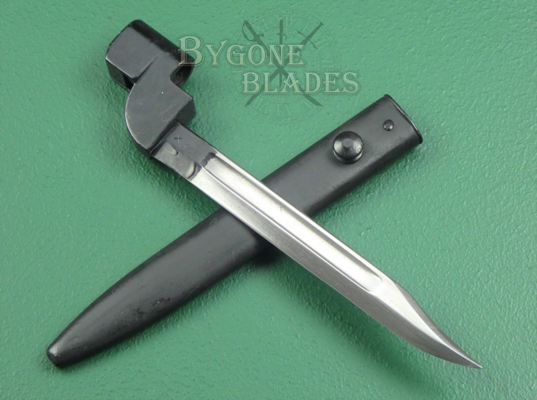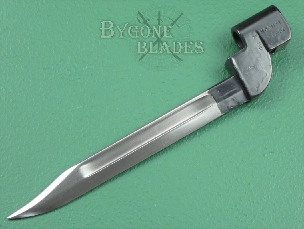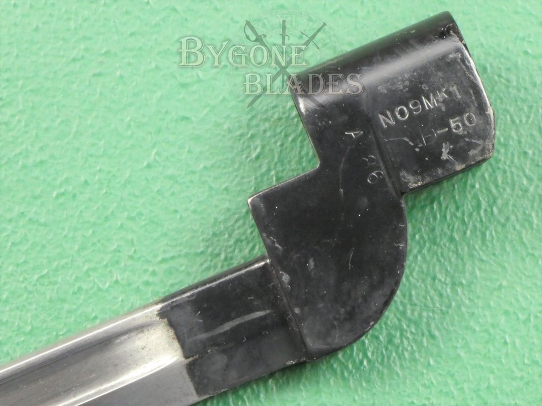 The British No.9 Mk1 socket bayonet was the result of a post-war desire to replace the unpopular No.4 spike bayonet. Production commenced in 1947.