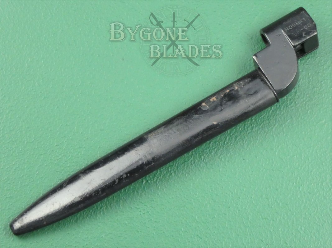 The bayonet is complete with its No.5 Mk I scabbard. The scabbard is in great condition and the bayonet sheathes and draws smoothly and is held firmly within.
