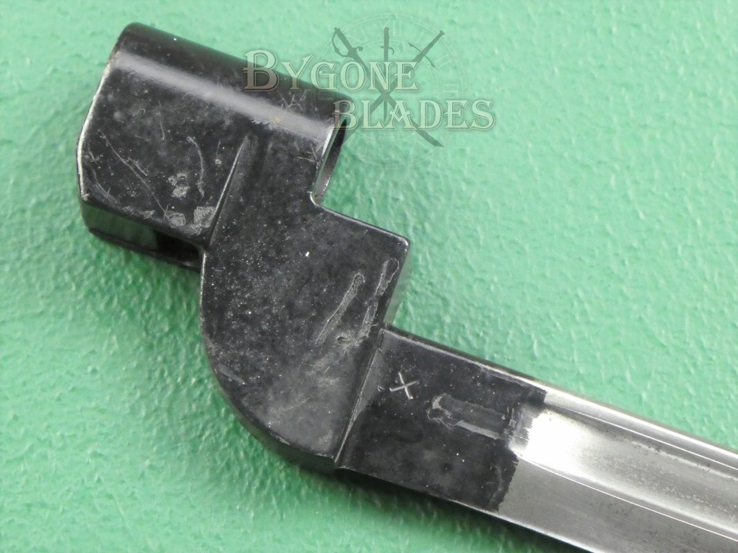 This bayonet was made at Enfield in 1950. The 202mm Bowie style blade has a rounded spine and terminates in a sharpened clip point. The blade has a deep single fuller and a factory sharpened edge. The blade retains its original finish and is stamped on the forte with a bend test X. The obverse forte bears a War Department arrow stamp.