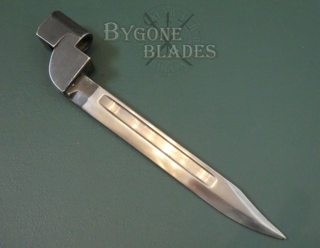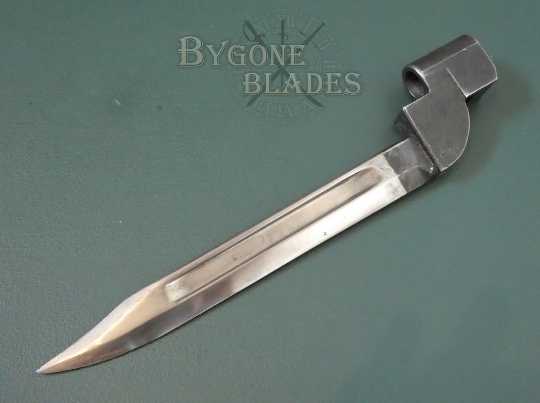 The British No.9 Mk1 socket bayonet was the result of a post-war desire to replace the unpopular No.4 spike bayonet. Initially, the innovative No.7 Mk1 Land Service bayonet was intended as the replacement, but due to safety concerns, the War Department decided not to issue the No.7 Mk.1/L bayonet with the Lee-Enfield No.4 rifle (it was only issued for service with the Sten Mk.V Submachine gun) so the No.9 was designed. In effect, it was the No.4 socket married to the clip point Bowie blade of the No.5 bayonet. This also meant that the No.5 scabbard could be used with the No.9 Mk.1 bayonet. Production commenced in 1947.