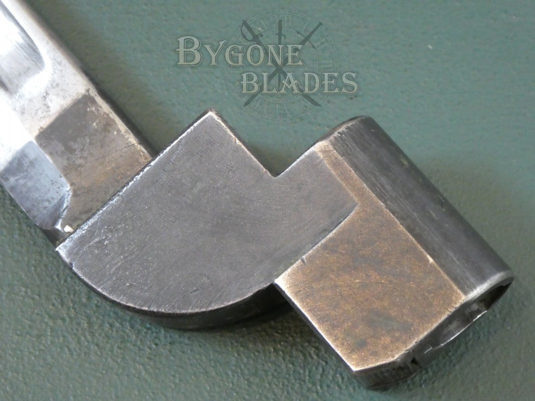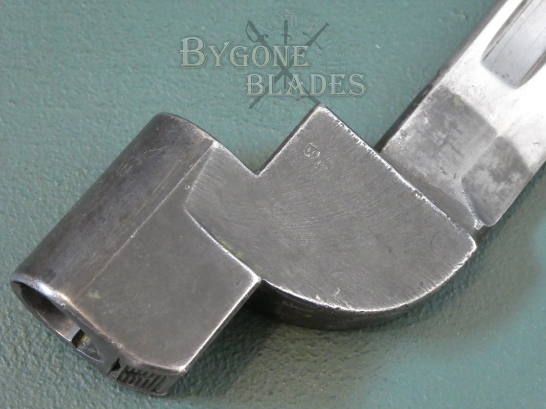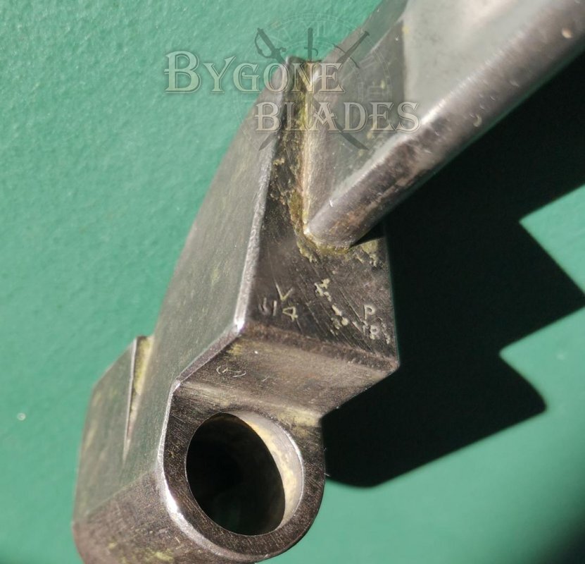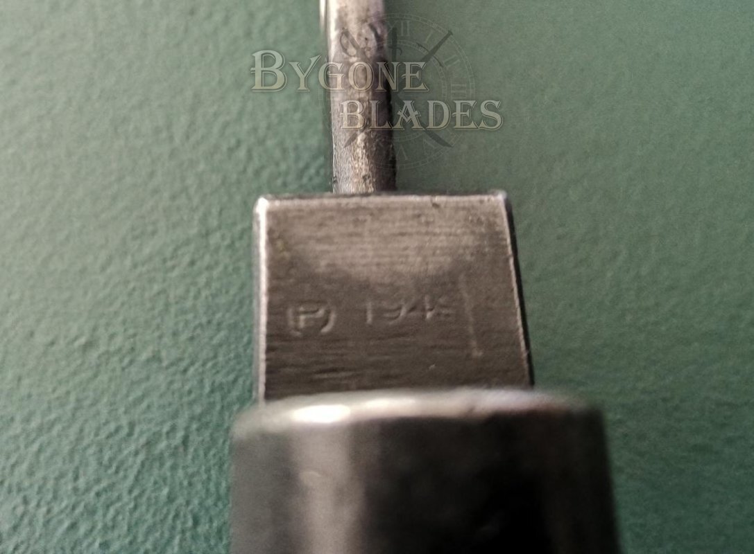 This bayonet was made by the Poole factory in 1949. The Poole maker mark, a letter "P" inside a circle and the year of manufacture, “1949,” is stamped on the top of the socket block below the muzzle ring. There are several stamps on the front of the block above the blade, these are a V above the number 114, the letter P and below that, the numeral 1 beside a second letter P. The right side of the block bears the stamp B5 and the top of the spring catch bears a Broad Arrow stamp.