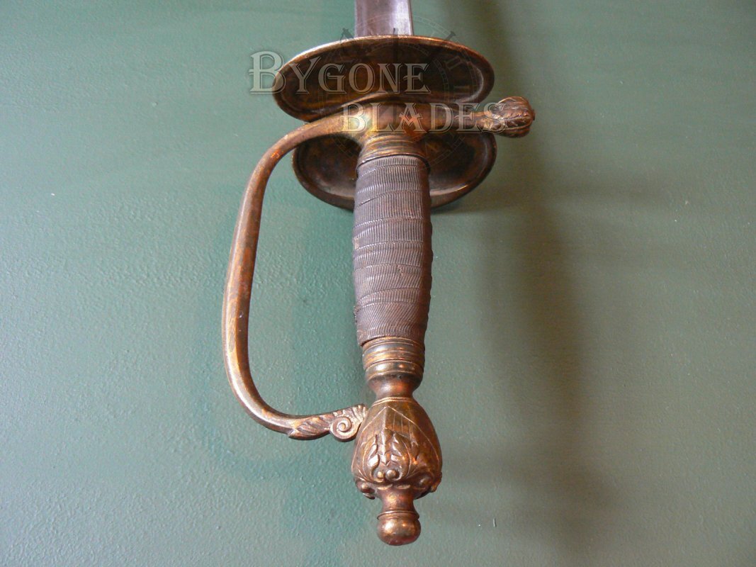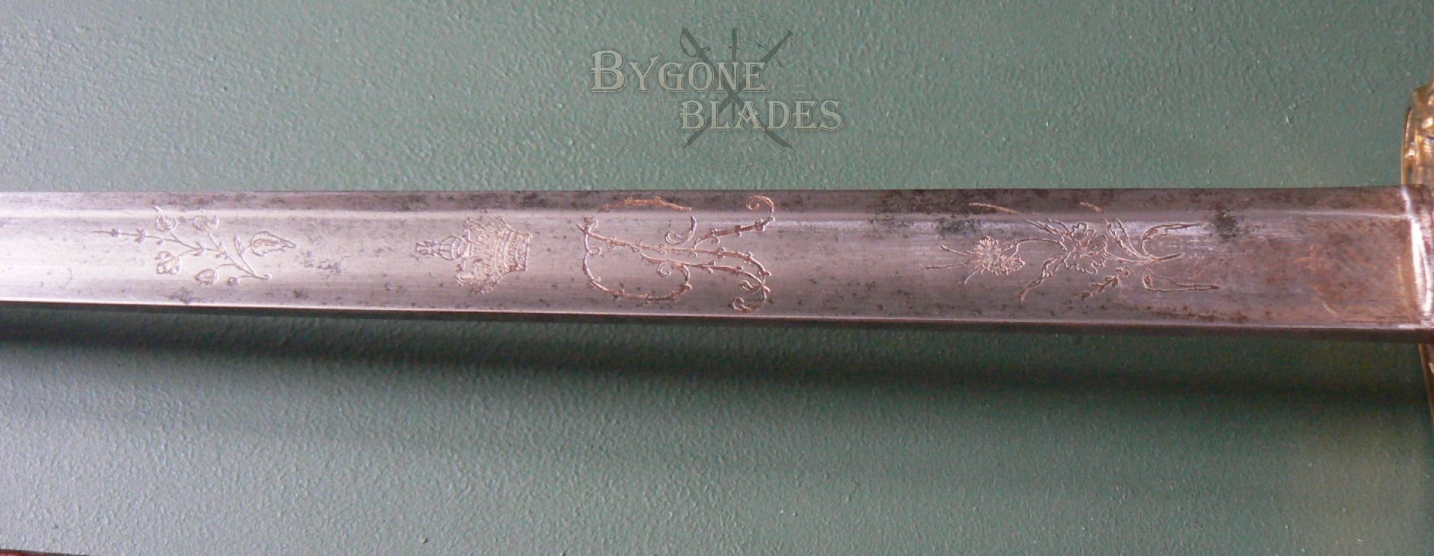 This sword has the early pattern fixed double shell guard. Later models adopted a folding guard to make wearing it more comfortable and to reduce wear to the officer's uniform. The "D" shape knuckle bow and pommel are decorated with a foliate design, the pommel being engraved with oak leaves and acorns on shields. The gilded brass hilt and guard are in good condition and will polish nicely if desired. The blade is firm in the hilt. There is some play in the guard, which is usual for this pattern as the guard is separate to the hilt and knuckle bow.