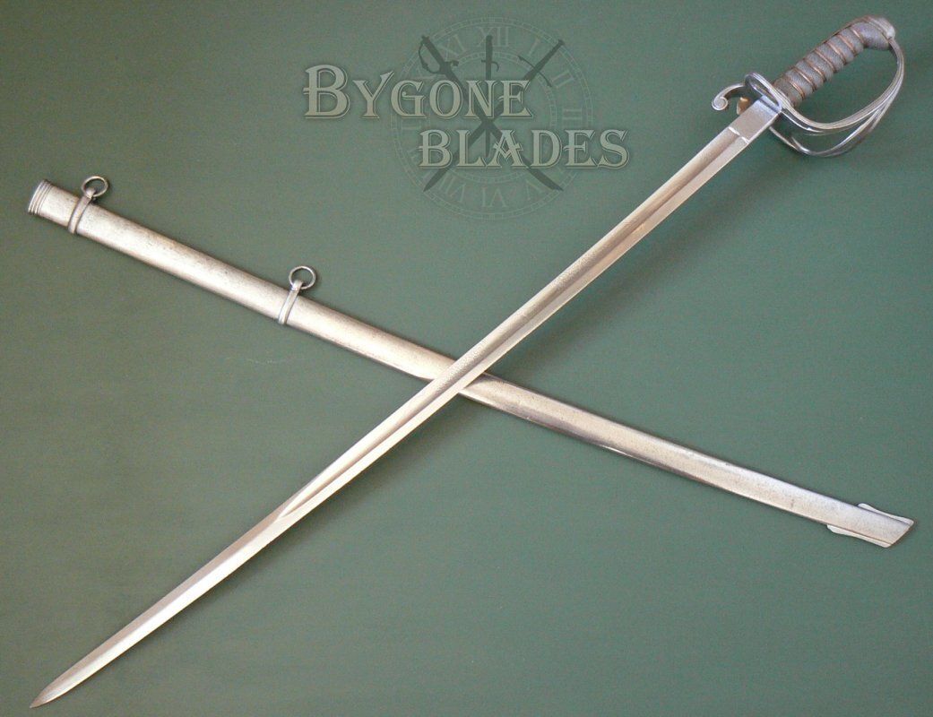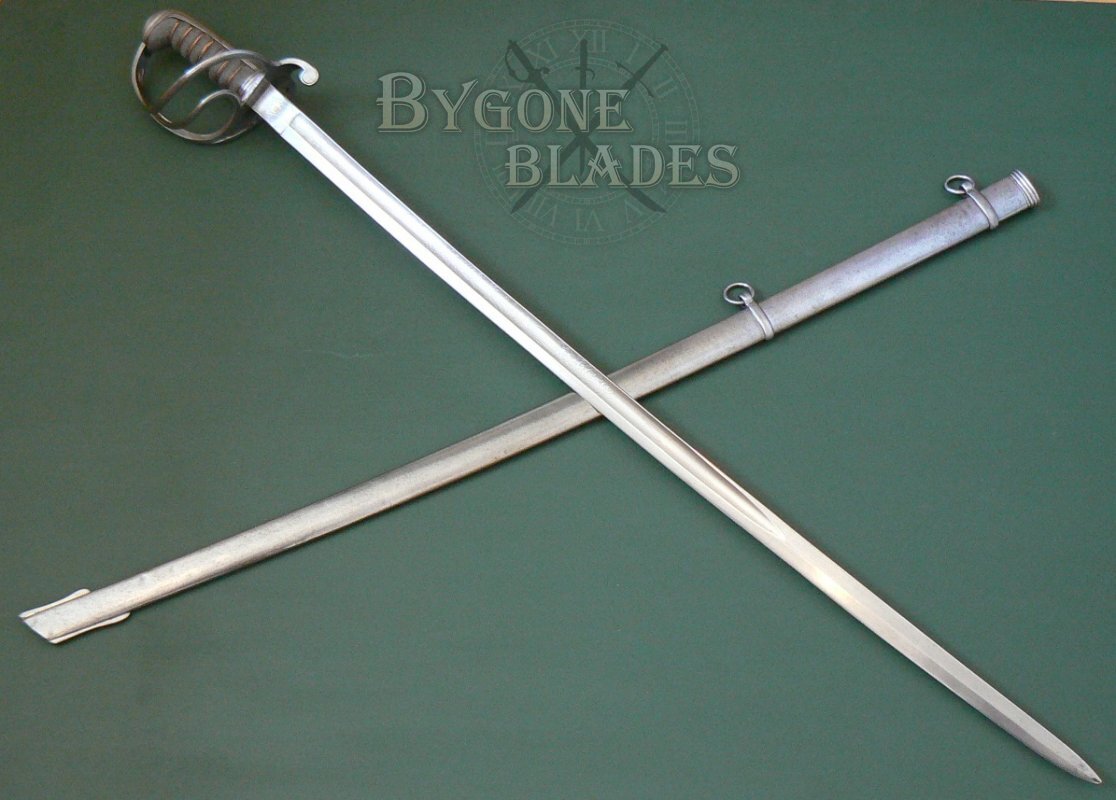 The sword comes in its original steel scabbard. The scabbard is clean and bright with a minor age colouration and is dent free. For some reason, the very tip of the drag has been removed. It looks to have been professionally done, although why, I cannot say. The sword fits perfectly within the scabbard and the tip is not exposed.