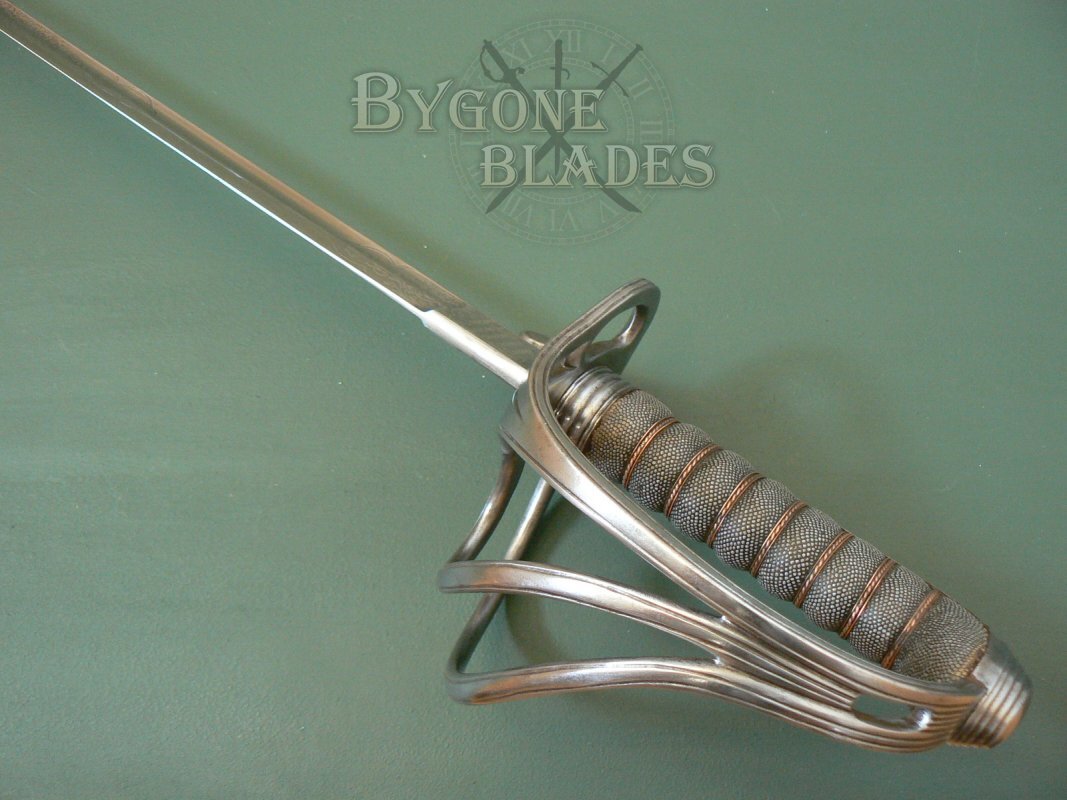 Great example of a Victorian Artillery officer’s sword that has been professionally sharpened for war. It is possible that this was done in preparation for deployment to the Crimea.