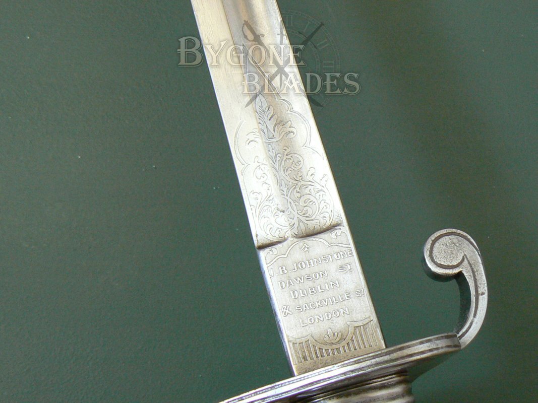 The blade is in good to excellent condition with almost no age tarnish. The ricasso bears the name and address of the Military cutler J. B. Johnstone. The obverse ricasso bears a brass proof slug with a fleur-de-lis.
