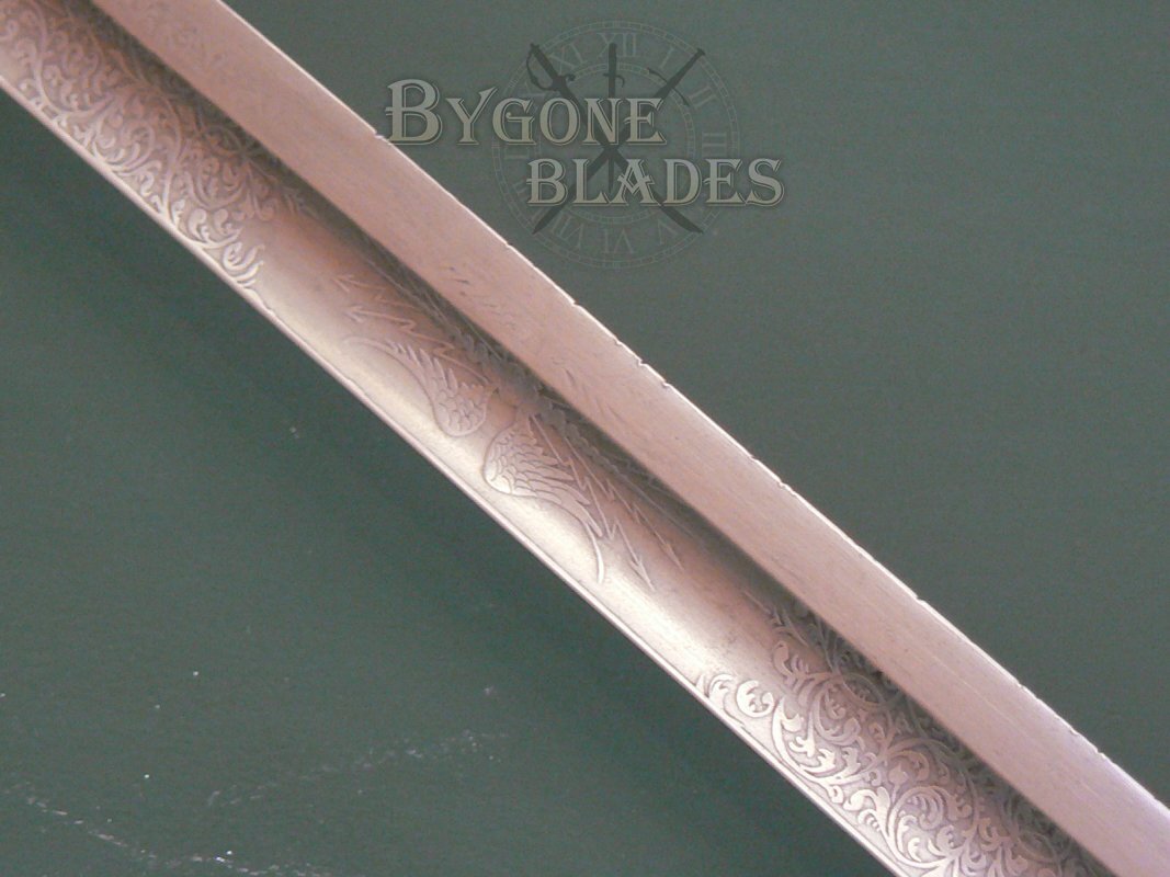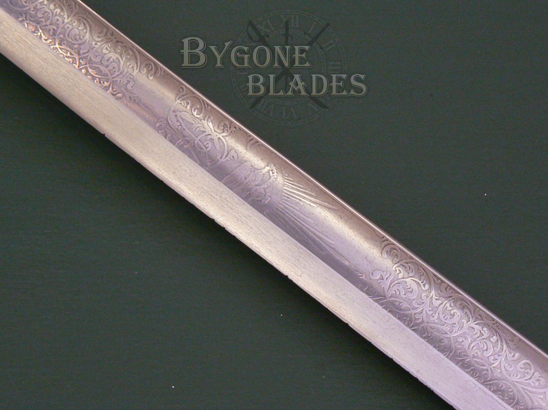 The 873mm slightly curved blade has a broad spine and a single, wide fuller on both sides. The blade terminates in a spear point. The blade is crisply etched with Queen Victoria’s Royal cypher amidst foliate scrollwork. The obverse of the blade shows the winged lightning bolts of the Artillery. The blade has been armoury sharpened to give it a fighting edge and in so doing, removed the cutting edge half of the etching. The blade shows a few small contact nicks along the edge and is still sharp, especially towards the spear point and along the upper edge.