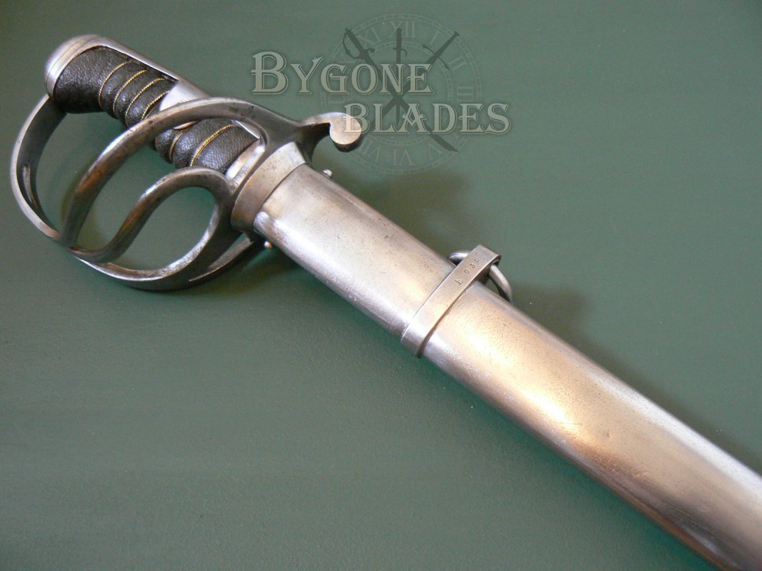The steel scabbard is in excellent condition. The scabbard ring mount is stamped “A E” on one side and “E636” on the other. The scabbard has a few small areas of tarnish on the bottom half. The sabre sheaths and draws perfectly and is held tightly without rattle or play.