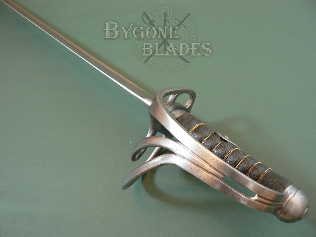 The steel 3-bar guard is bright with minimal age related marks and scratches. The rearward facing quillon is stamped “A E.” The shagreen grip is in good condition and the wire binding remains mostly intact. There is slight movement in the guard, probably due to shrinkage of the wooden grip. The blade is firm in the hilt.