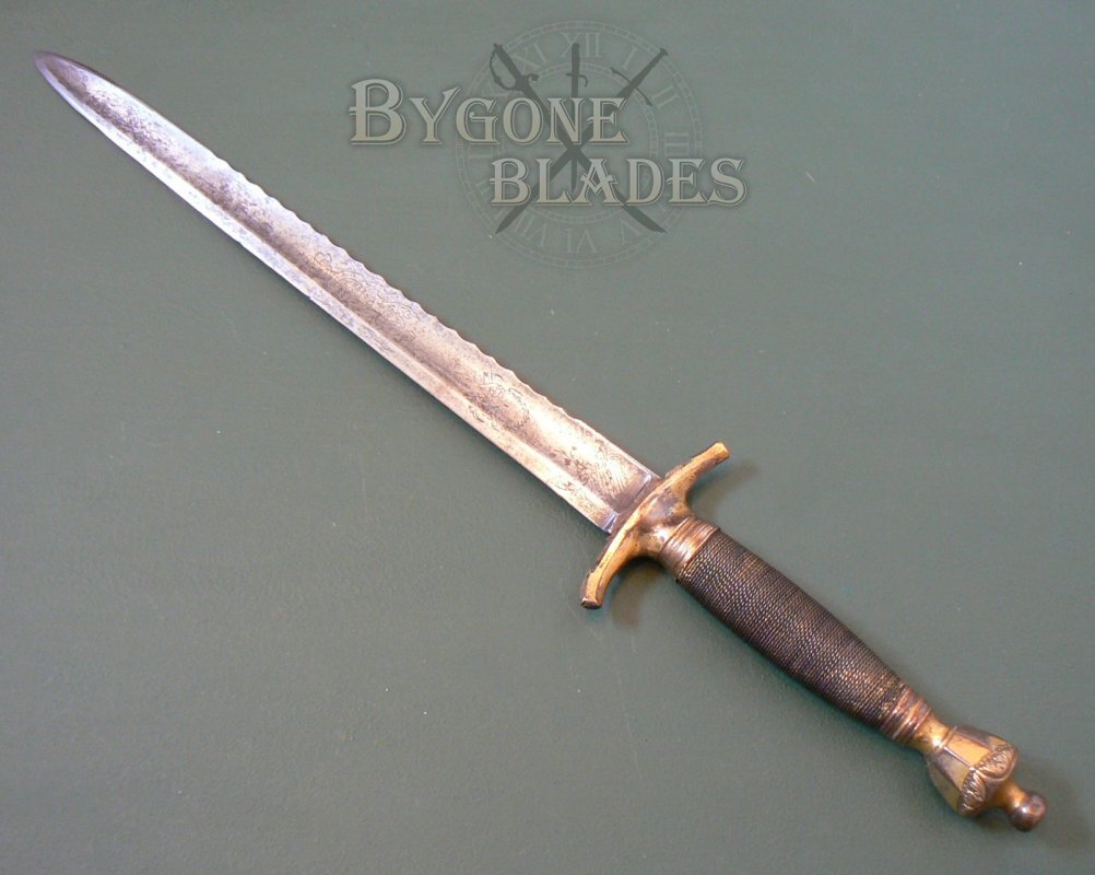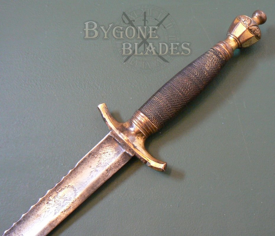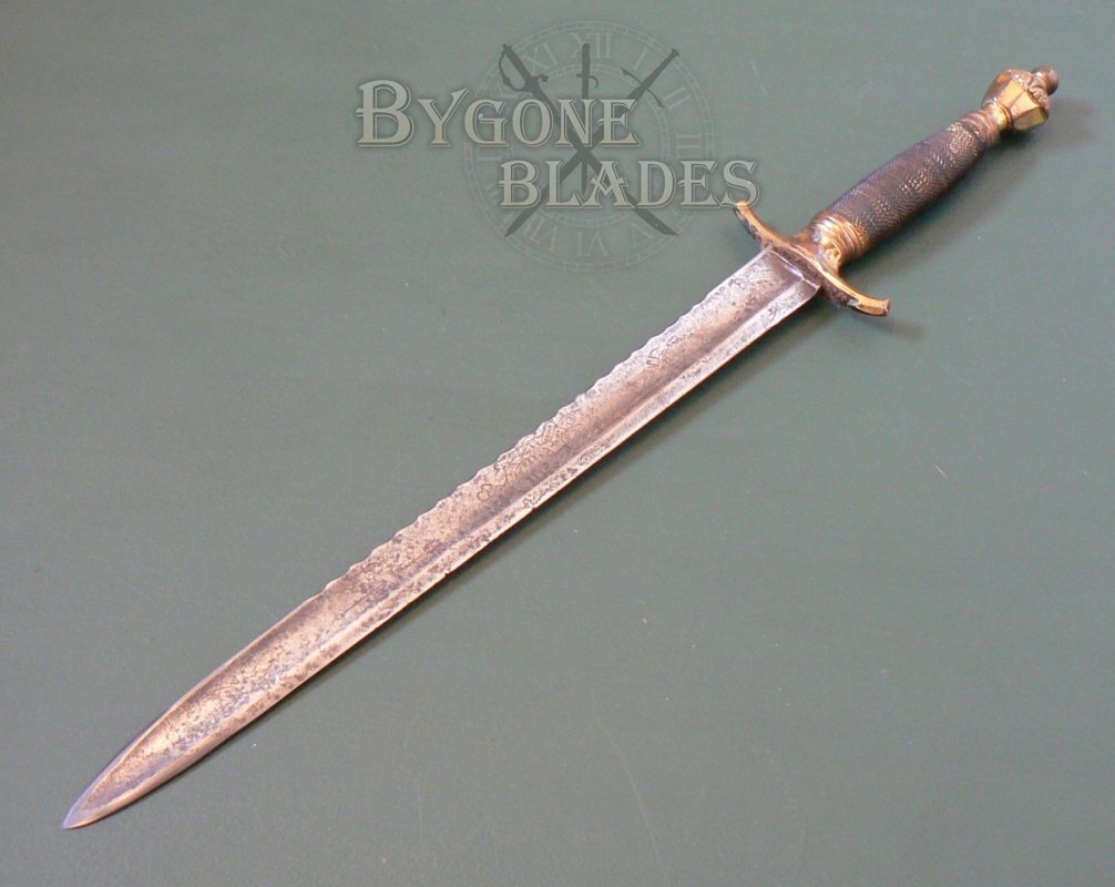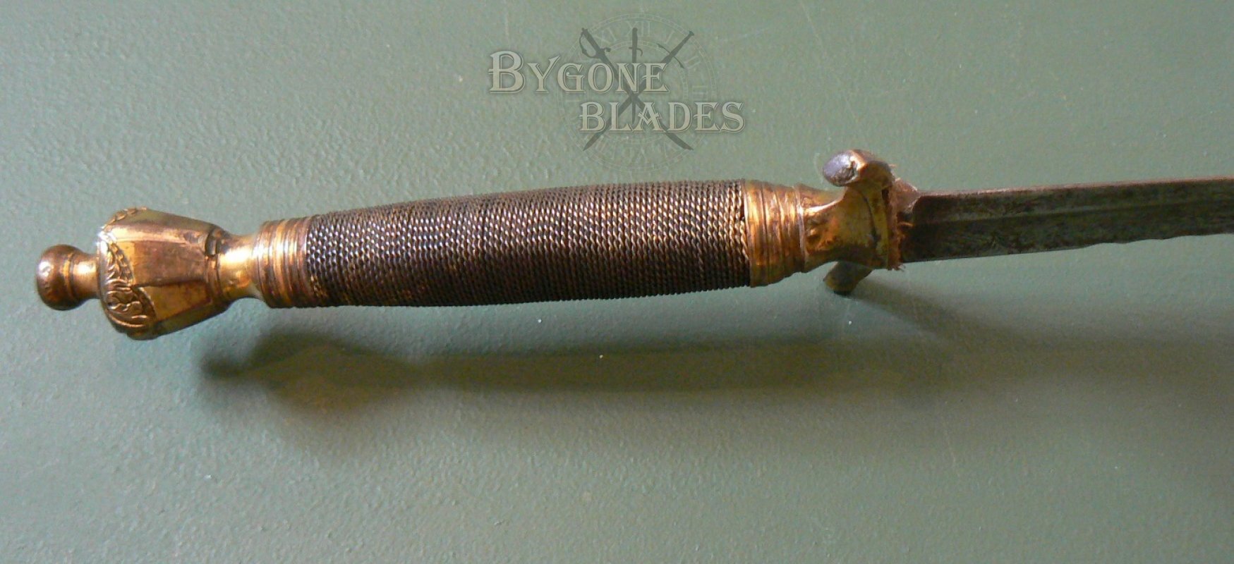 The dirk is in overall good condition with most of the gilding on the hilt remaining and the twisted brass wire is intact and tight. The blade is firm in the hilt.