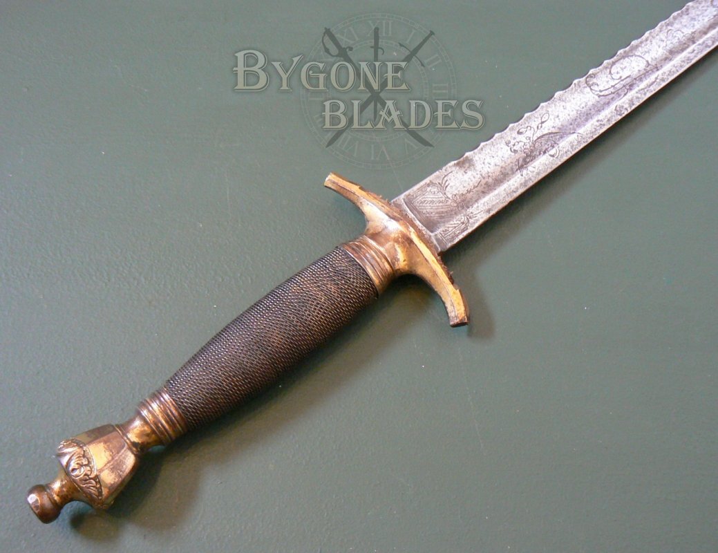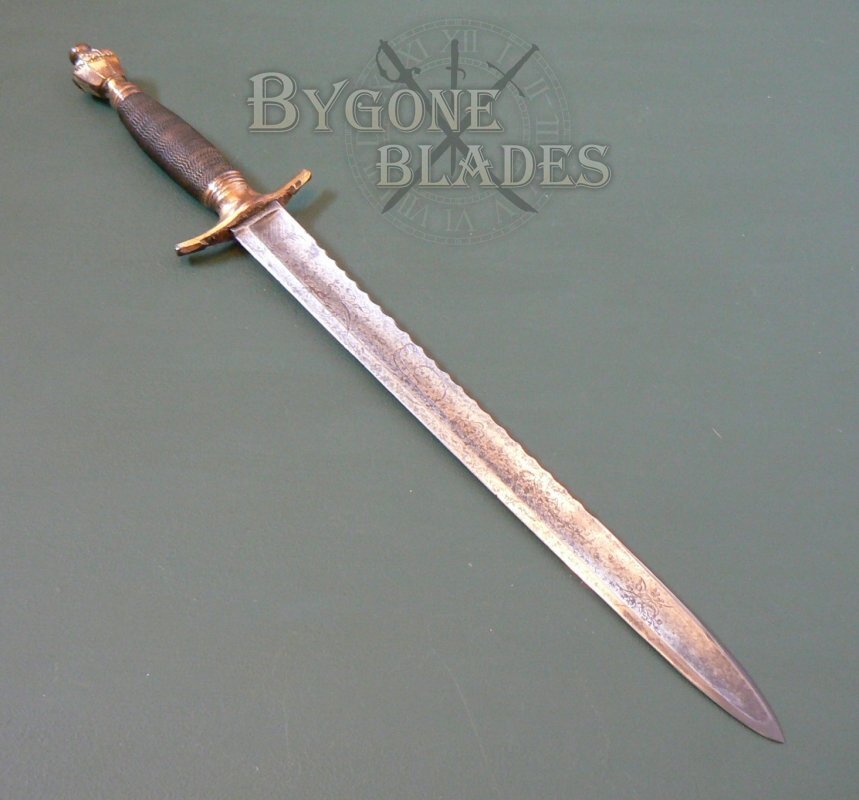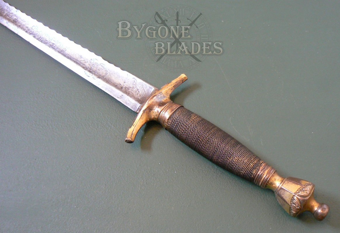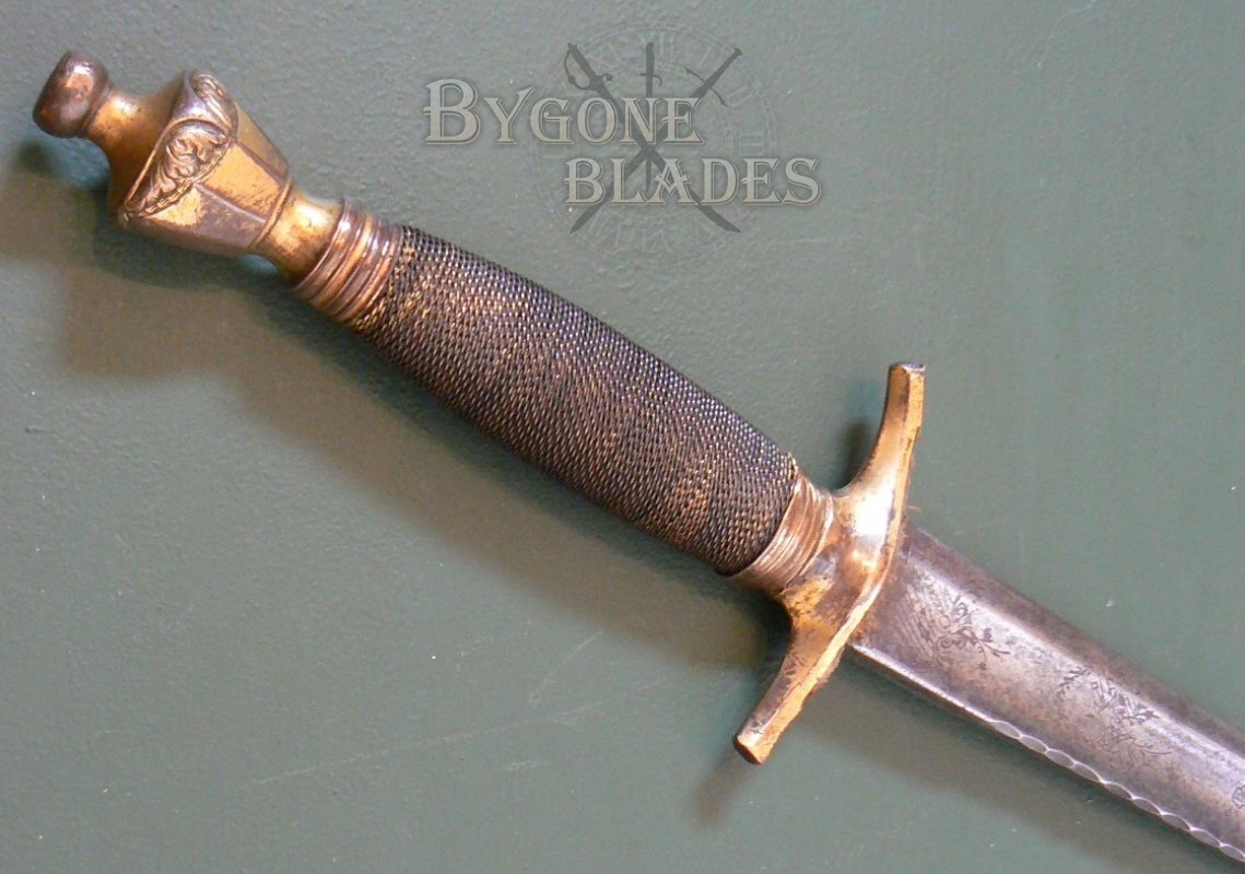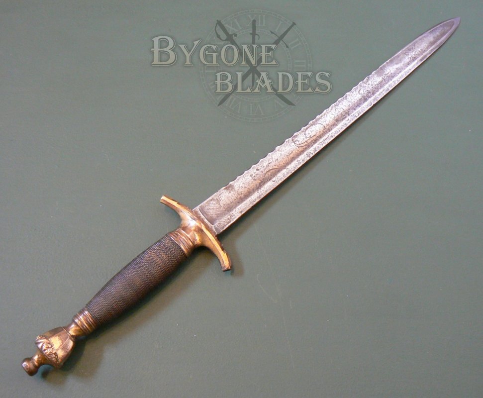 The dirk is in overall good condition with most of the gilding on the hilt remaining and the twisted brass wire is intact and tight. The blade is firm in the hilt.