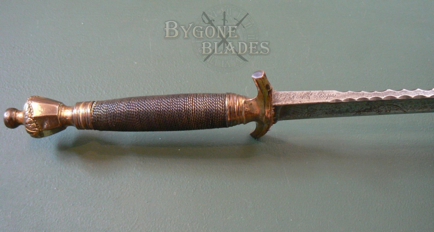 The 225mm blade is in good condition with a mild salt and pepper patina. The blade retains its fighting edge and has a few minor edge nicks, testifying to its use. The scalloped spine is signed with the original maker’s name, “J.J.Runkel, Solingen” and the ricasso bears the name “D. Neef,” which could be either the blade-smith who re-worked it or the cutler who sold it.