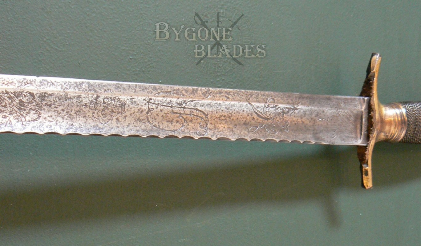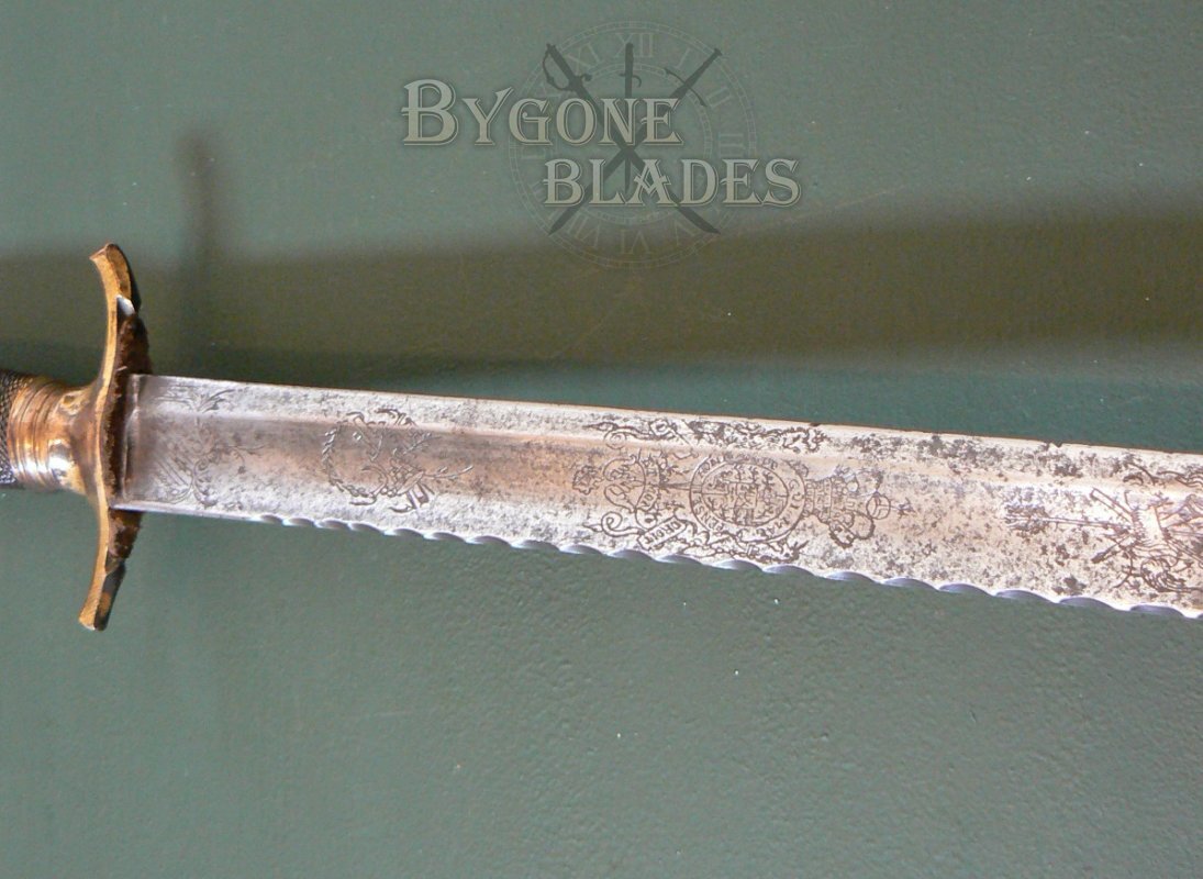 The blade is engraved with trophies of arms and flowers above and below the Georgian crown and Royal cypher of George III. The obverse of the blade is engraved with trophies of arms and the Royal coat of arms and motto.
