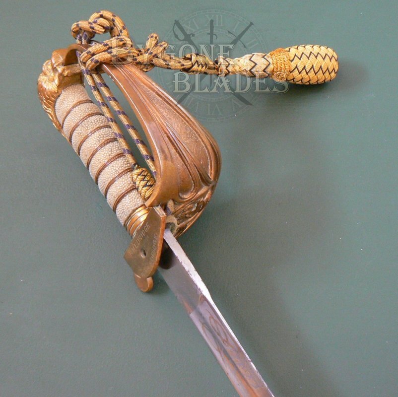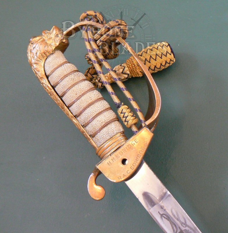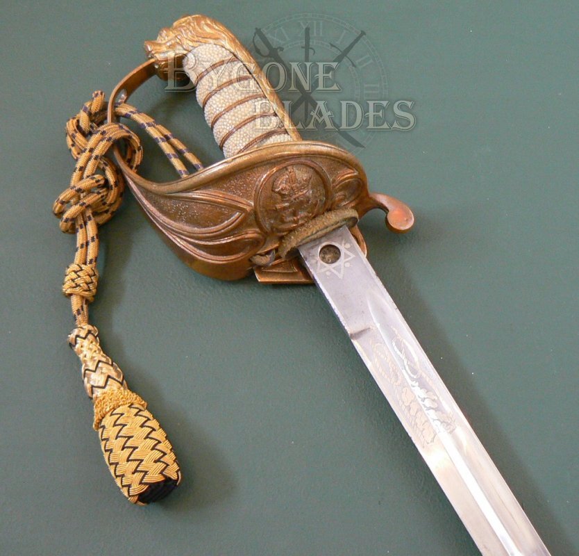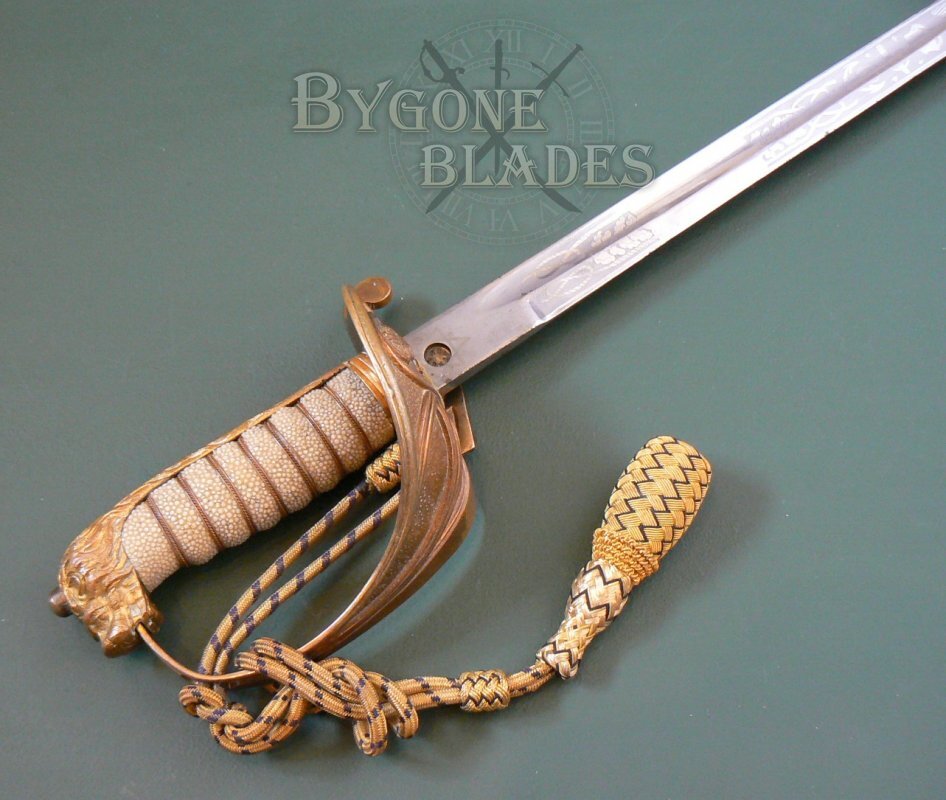 The mane of the highly detailed lion head pommel forms the back strap and the “D” guard extends from the lion’s mouth, again dating the sword to the early 20th Century. The guard is complete with the Royal Navy gold and blue bullion knot.
