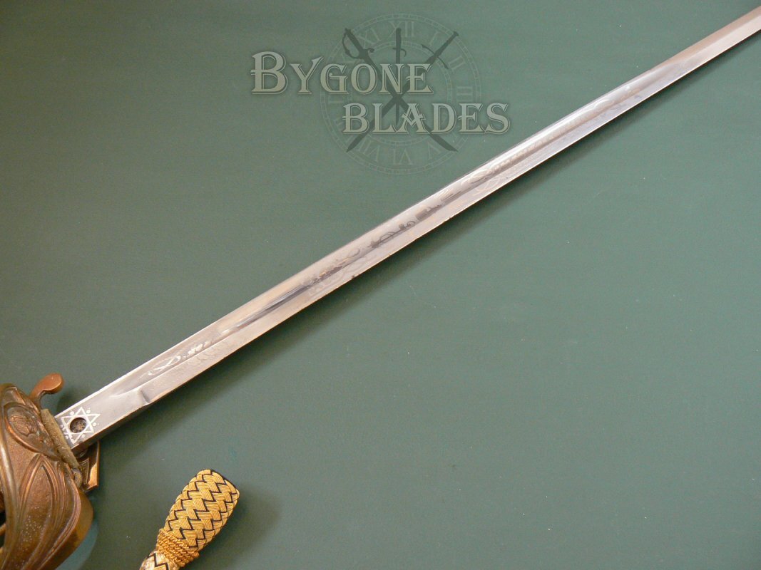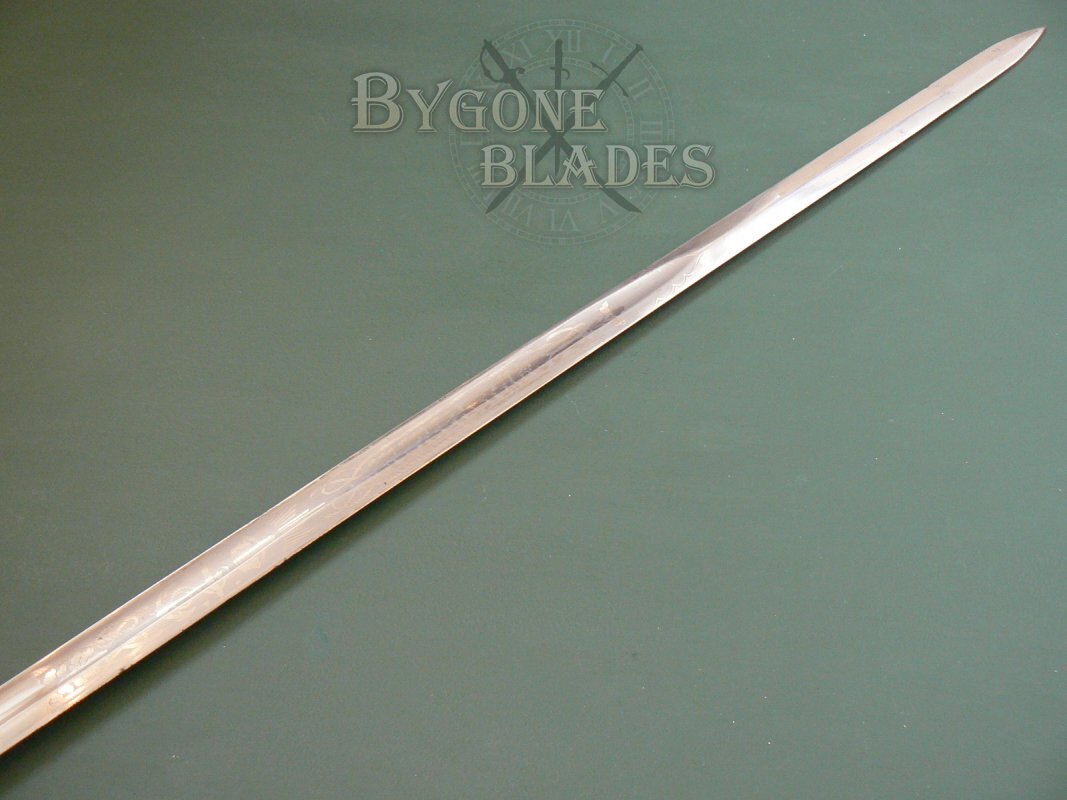 The ricasso bears a brass proof slug that is known to have been used by Manton & Co. The obverse ricasso is left purposely blank. This combined with the lack of a monarch’s cypher indicates the sword was of war time production, dating it to between 1914 and 1918. The spine of the sword bears the legend, “London Made.”