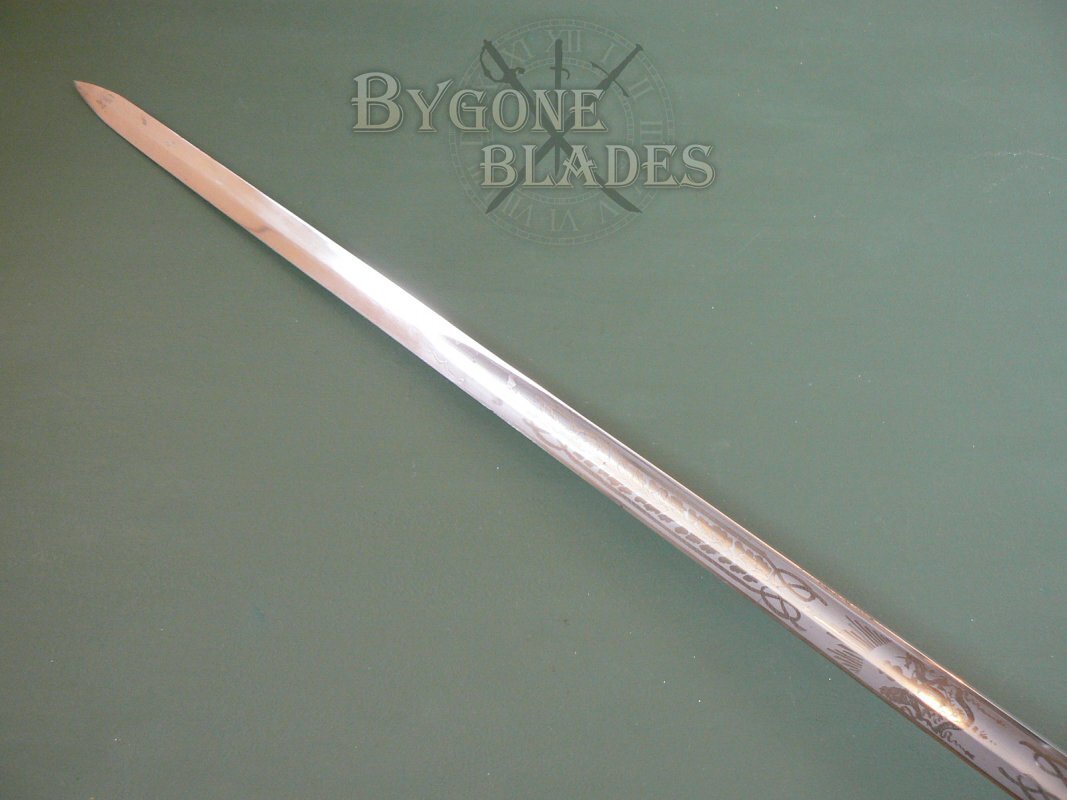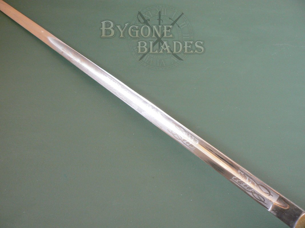 The blade is etched with a Georgian crown and the Royal Navy fouled anchor motif between fouled oak leaves and acorns. The obverse of the blade bears the Royal coat of arms amidst fouled oak boughs. The blade is clean and bright and in excellent condition for its age.