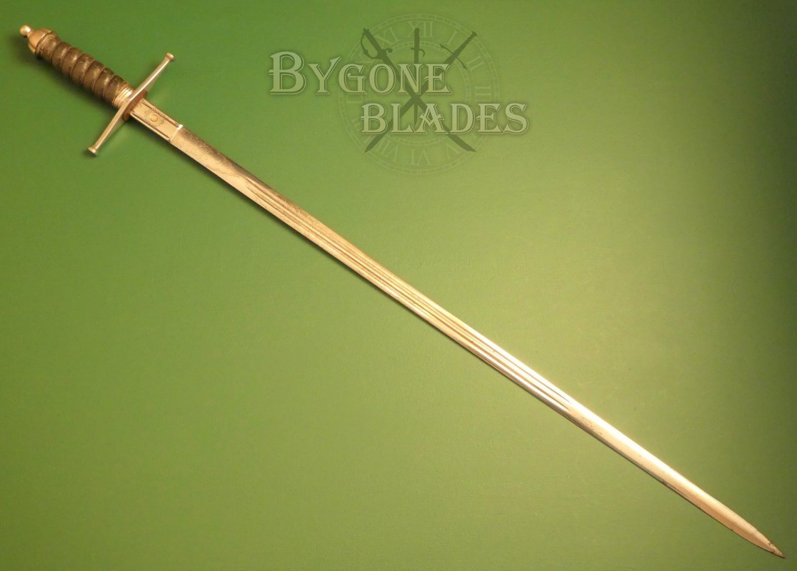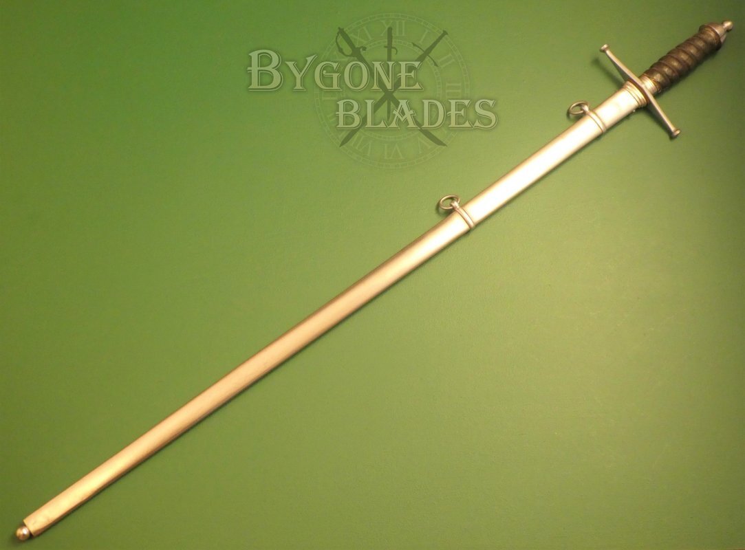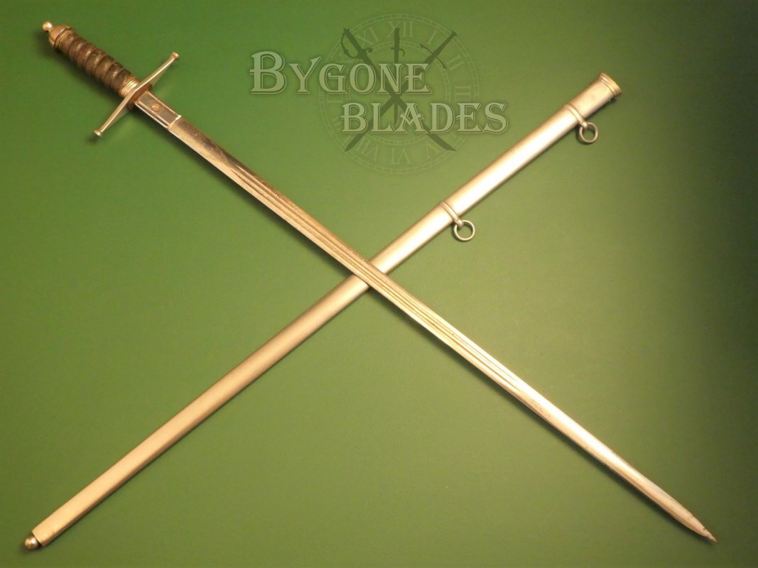 The broadsword is complete with its polished steel dress scabbard with twin suspension rings and a ball terminal. The scabbard is in very good condition. The sword sheathes and draws smoothly and is held firmly within the scabbard.