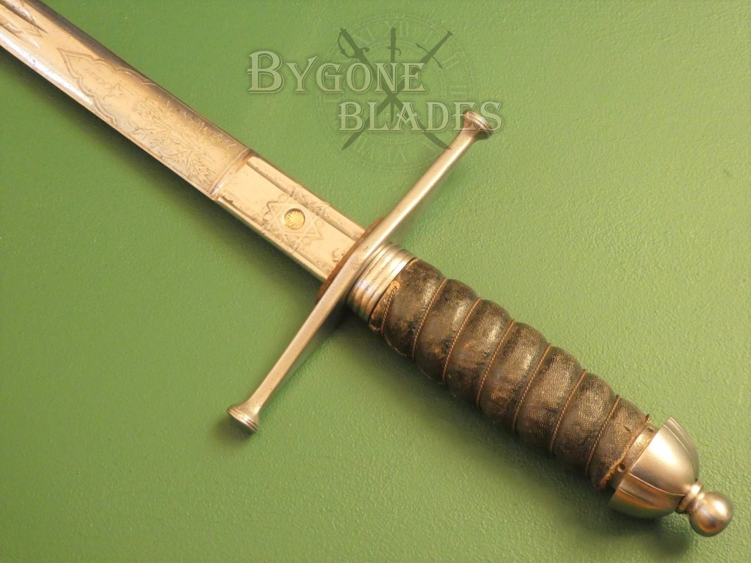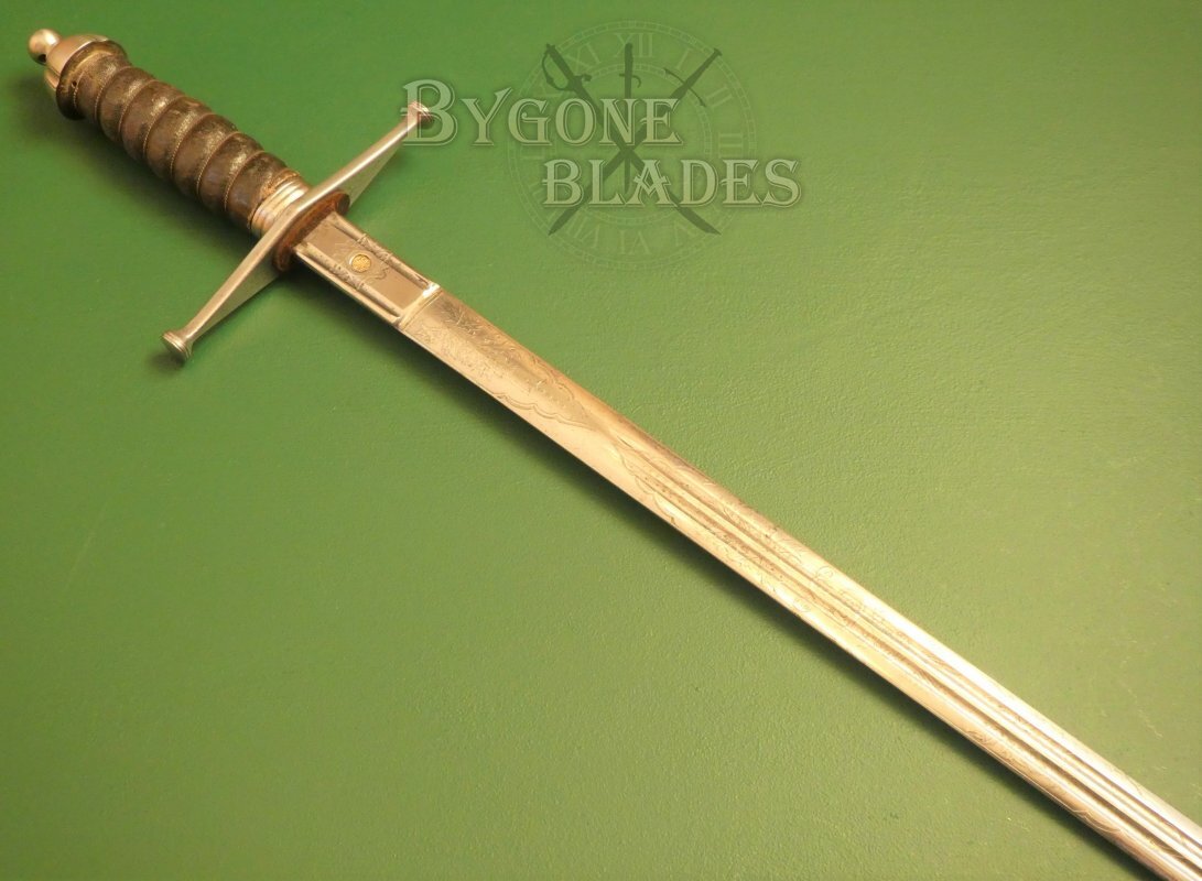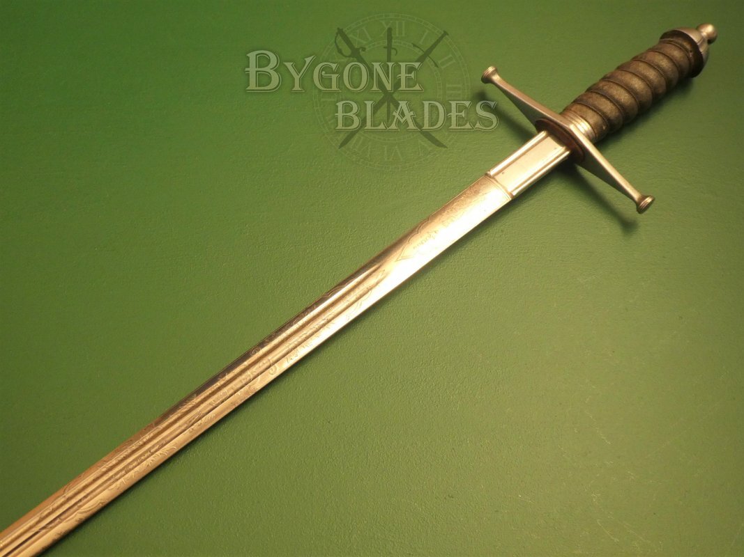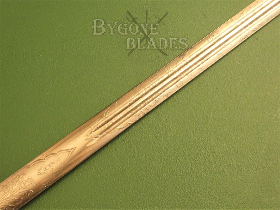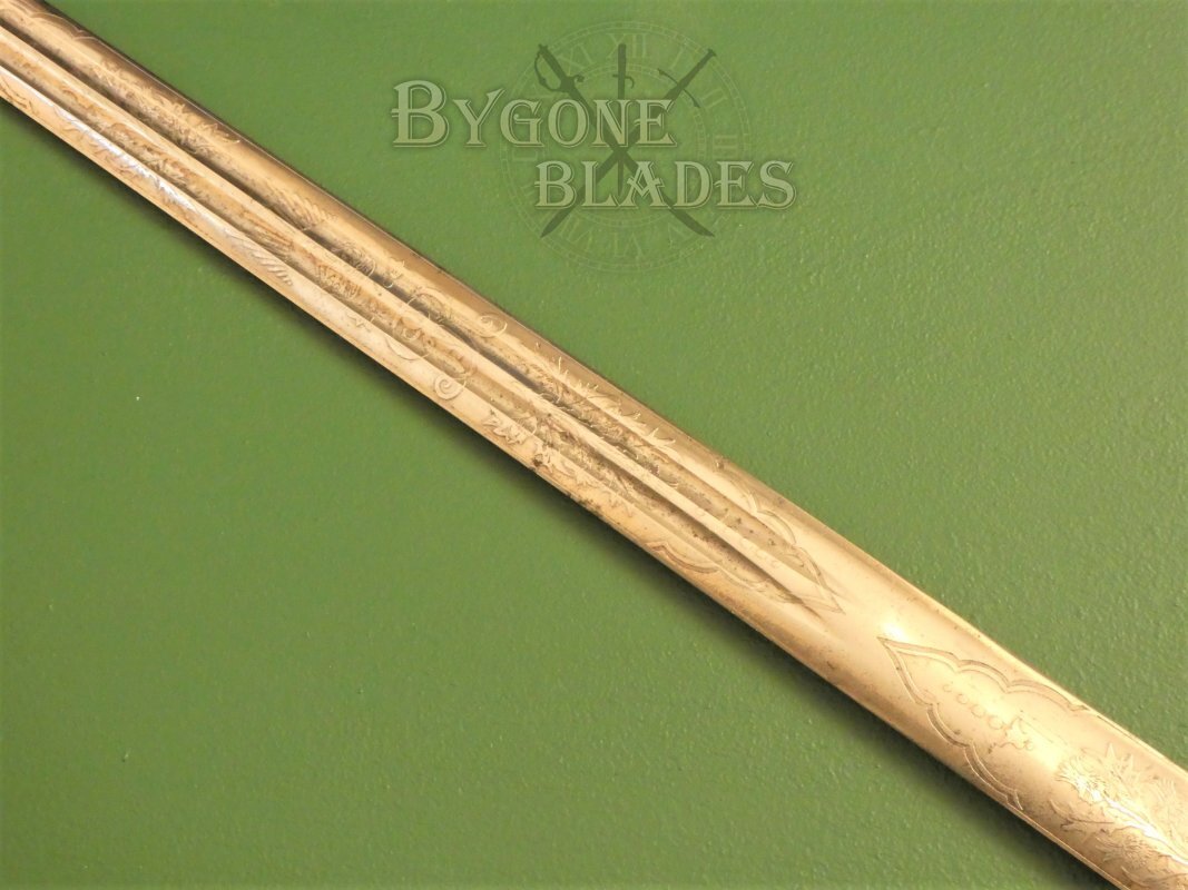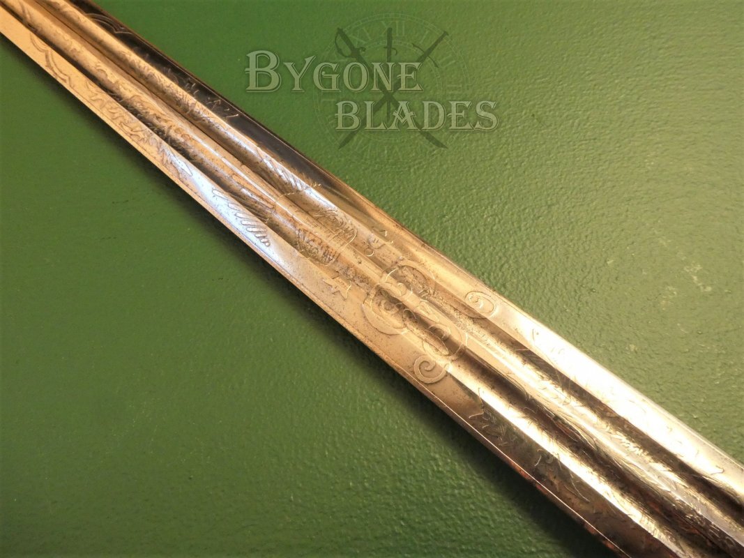 The 838mm double-edged (broadsword) blade has two narrow central fullers and terminates in a spear point. The un-sharpened blade is in good condition and is etched with the royal cypher of King George V amidst arches and thistles. There are some minor speckles of tarnish amongst the etching and along the edges and some spots of darker tarnish towards the point.