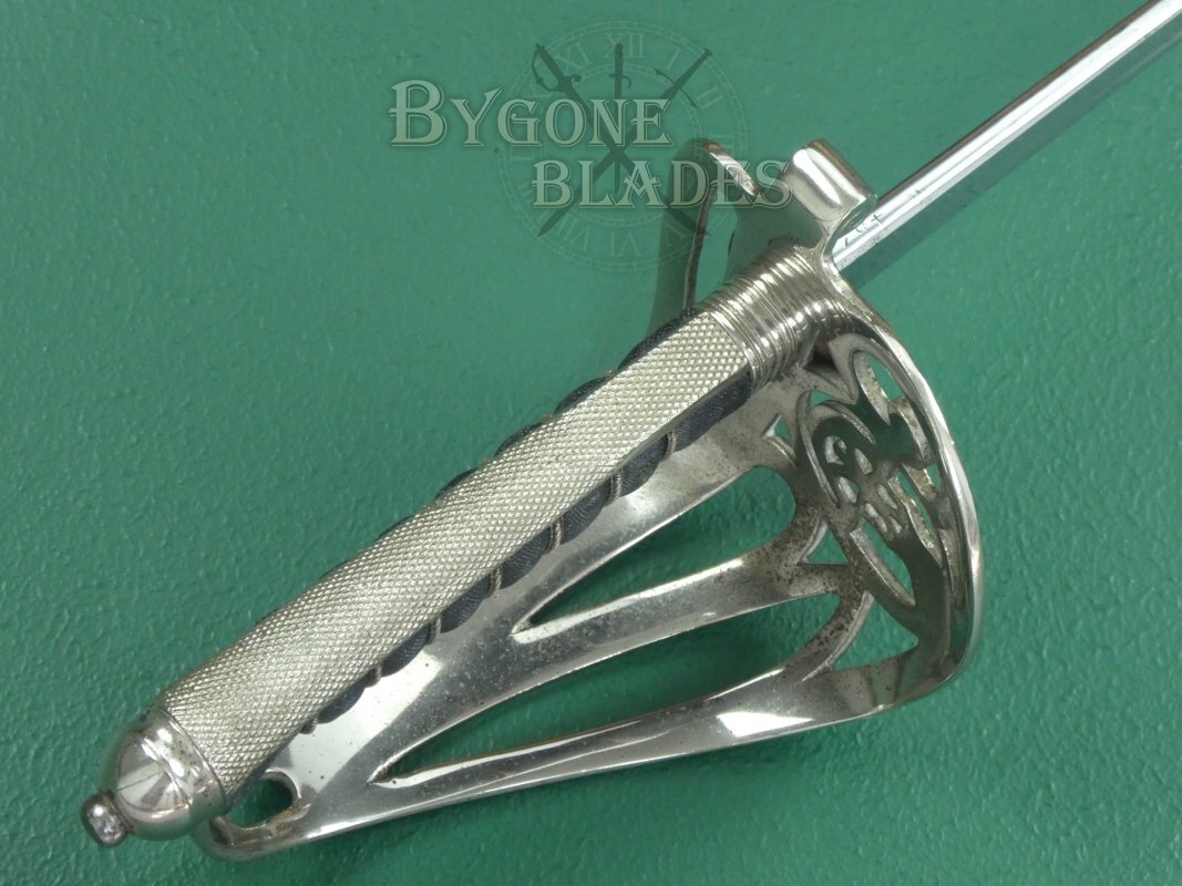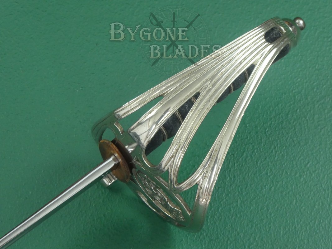 The Gothic steel guard incorporates an oval cartouche containing the crown and strung horn of the Rifle Regiment. The guard is bright and rust free and the plating is in overall excellent condition. The shagreen grip is in excellent condition and the twisted wire is intact and tight. The blade is firm in the hilt.