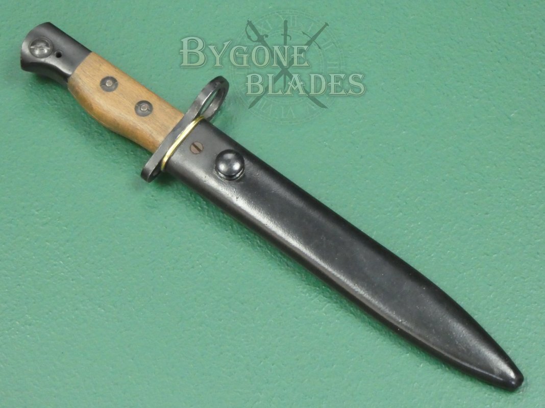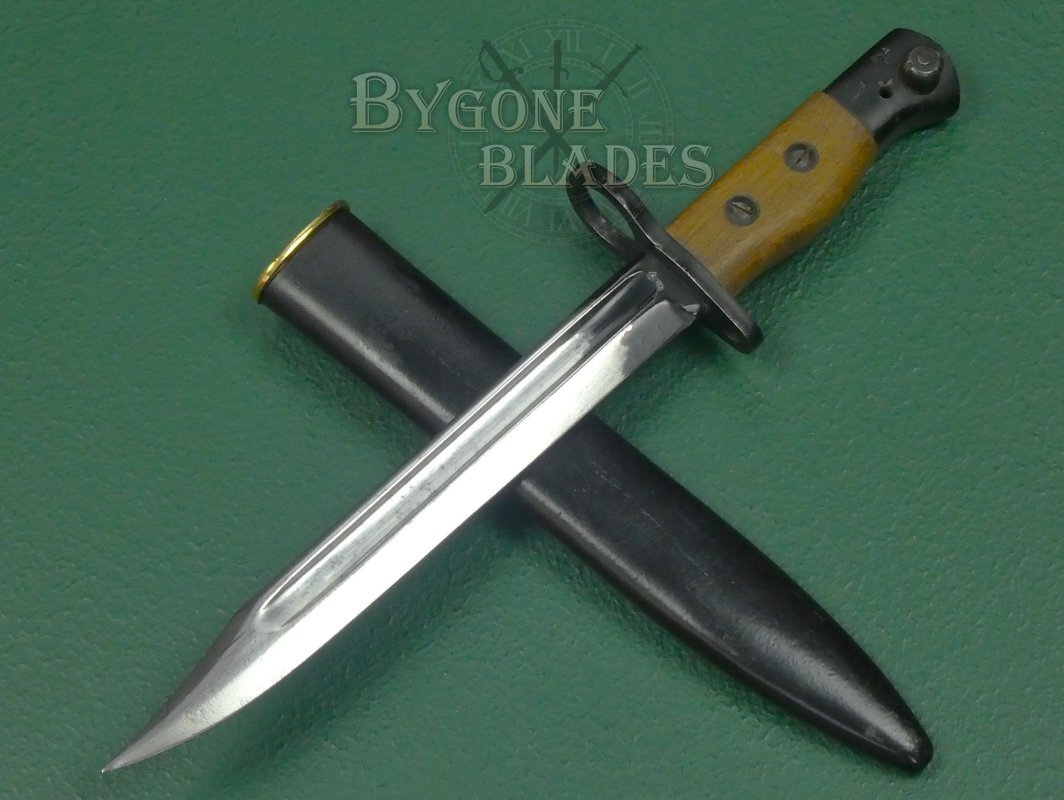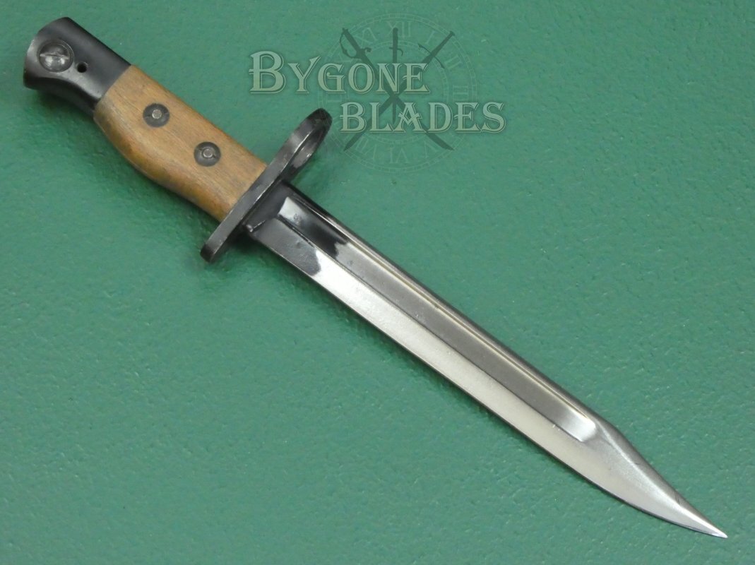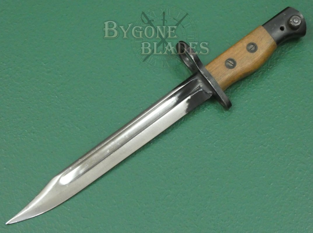 This British No.5 bayonet was made by Hopkinson of Sheffield in 1975 for use with the Sterling Sub Machinegun. It is quite scarce. The Sterling SMG was trialled by the British army late in WW2, between 1944-1945, but did not come into regular service until 1953. The Sterling SMG was also supplied to a variety of overseas military and police units. Surplus MOD parts from the No.5 Jungle carbine bayonet were often used in their construction. The No.5 pommel, wooden grip scales and grip screws on this bayonet are examples of this. The pommel was produced by the Birmingham Small Arms Factory (B.S.A.) under MOD contract.