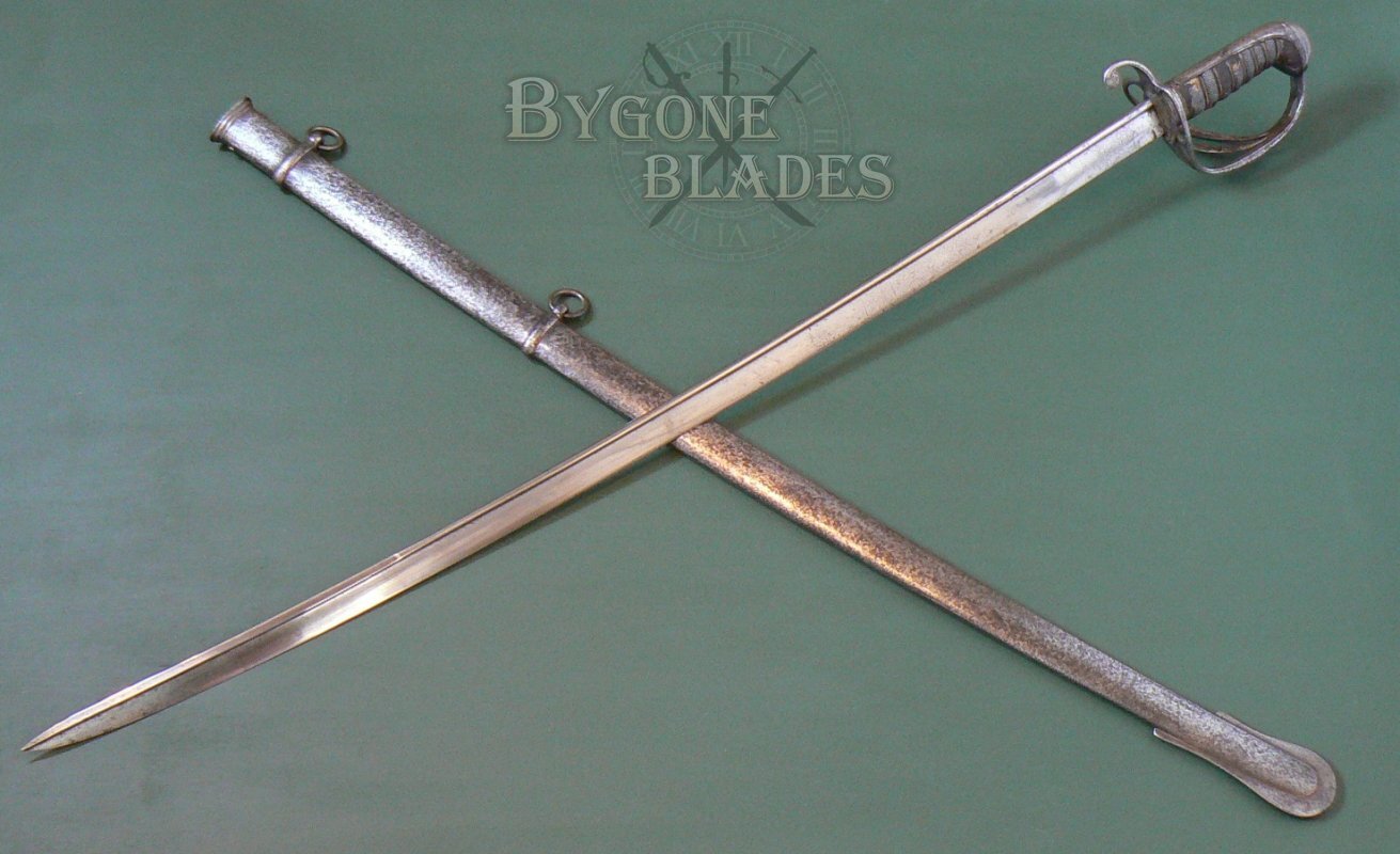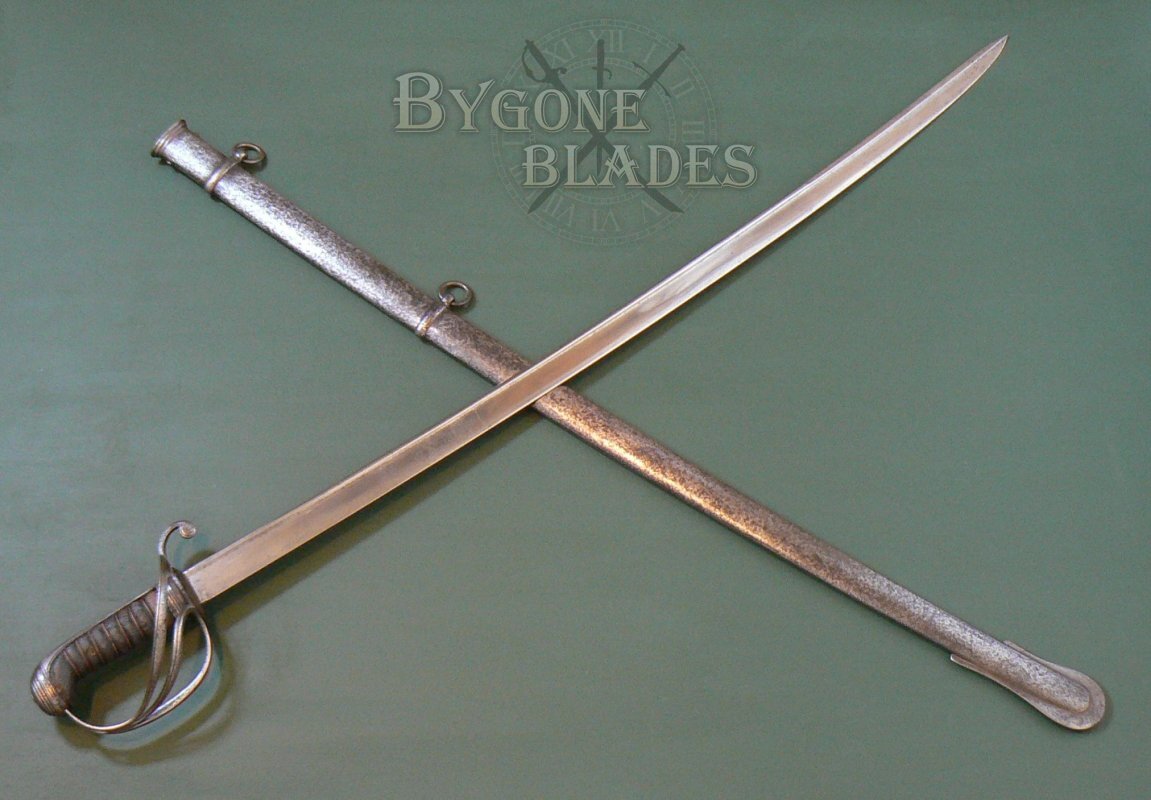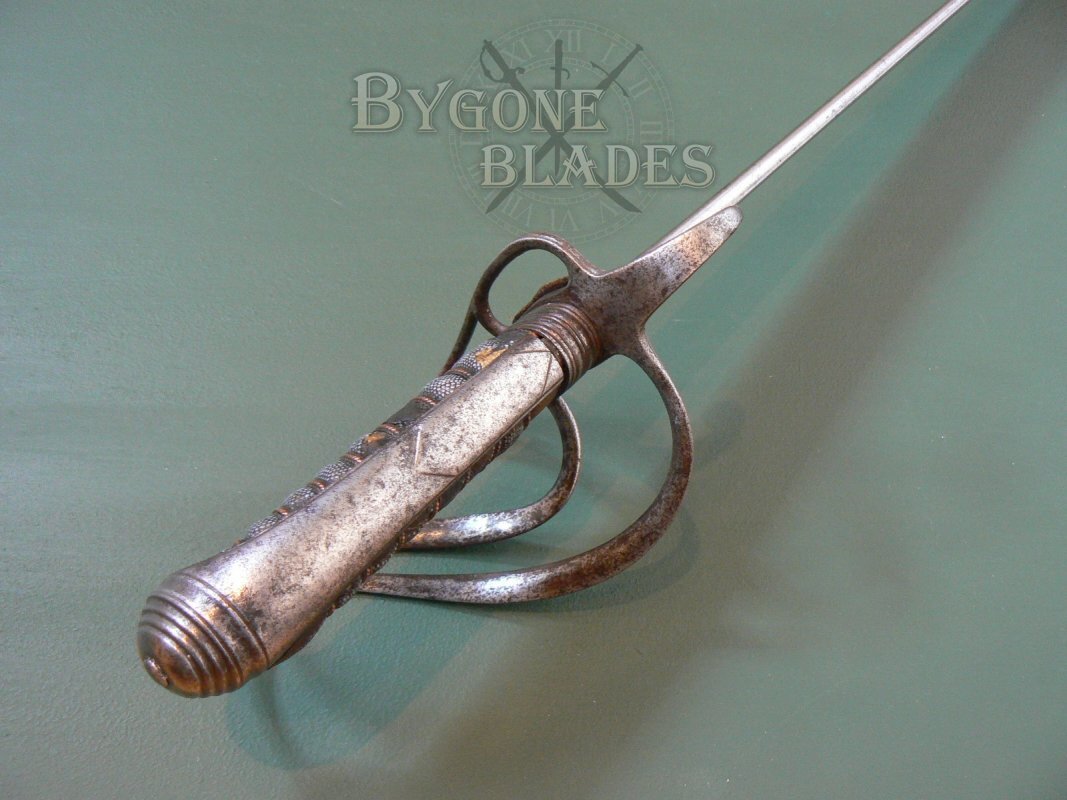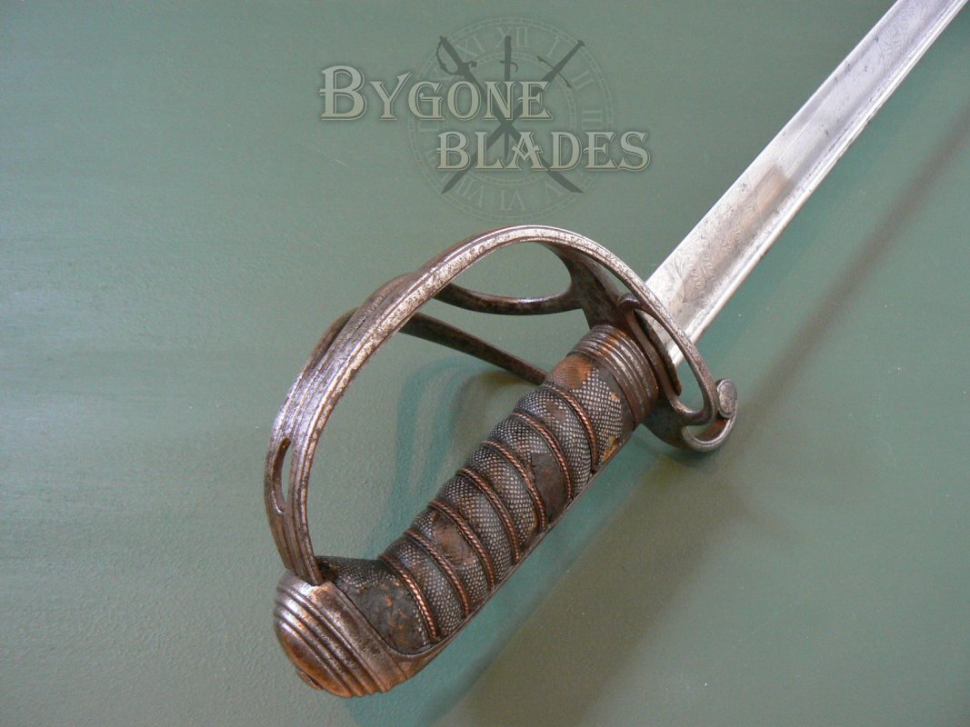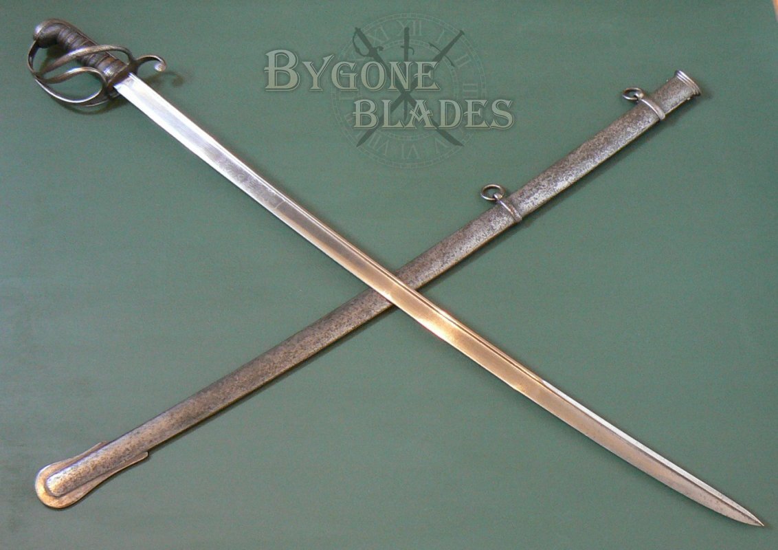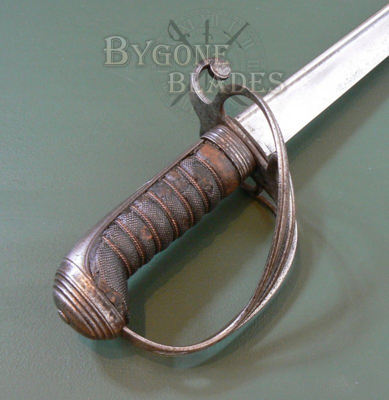 The steel three-bar cavalry guard is in good condition with mild pitting and tarnish. The plain steel back strap, with slightly raised, lozenge shaped thumb section is finished with a stepped oval pommel and peened tang.