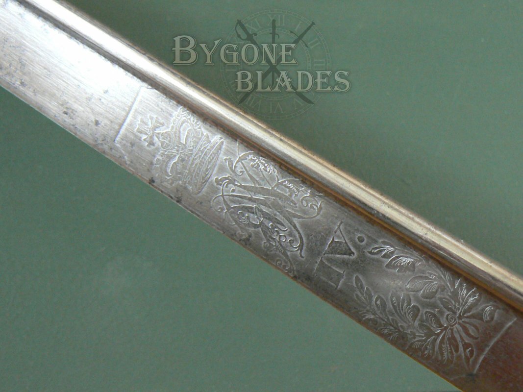 The blade is in excellent condition with only mild age related tarnish. It is undecorated apart from King William's crowned Royal cypher above laurels which is crisply etched about a third of the way down the blade on both sides.