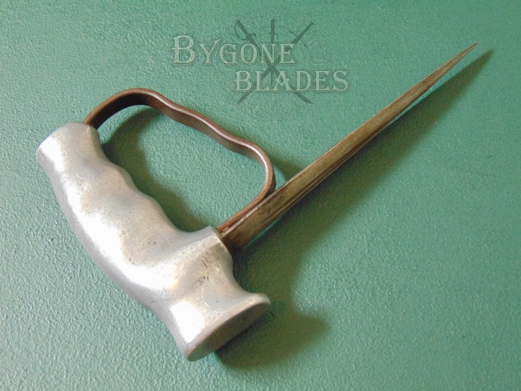 For collectors of WW1 fighting knives, the Robins of Dudley knuckled punch knife is a must have item. The 114mm double edged blade has a flattened oval cross-section and terminates in a spear point. The blade has narrow, converging twin fullers on both sides and is in excellent condition. The blade has a pleasing patina and is uncleaned. The cast alloy grip and steel knuckle bow are in great condition and firmly in place. The blade is firm in the grip.