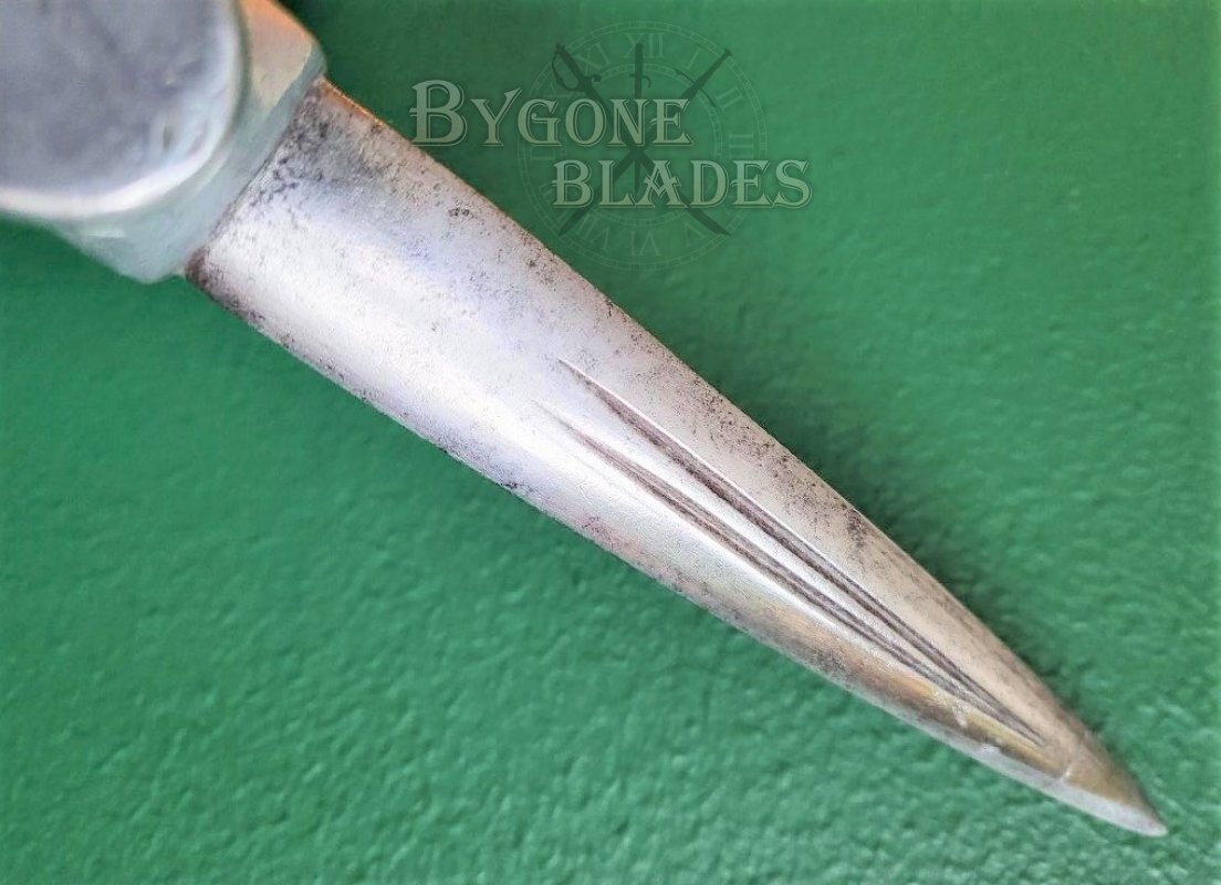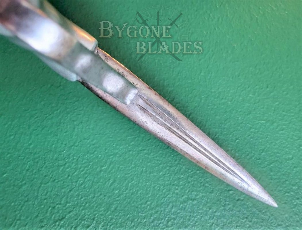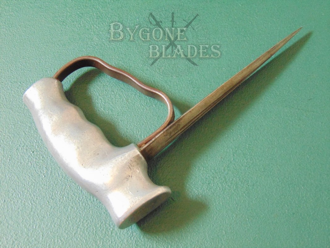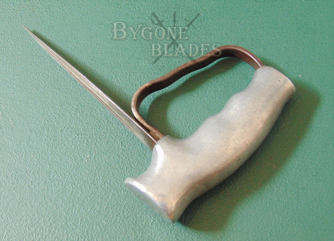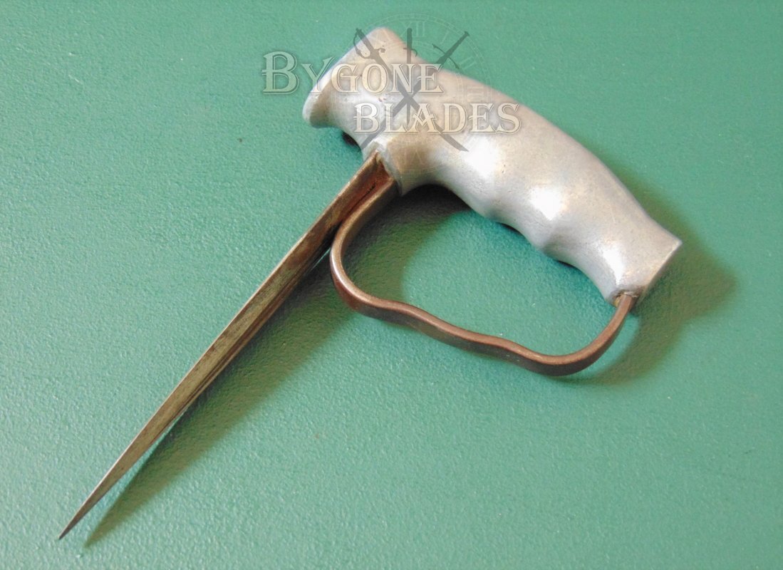 For collectors of WW1 fighting knives, the Robins Dudley knuckled trench knife is a must have item. The 114mm double edged blade has a flattened oval cross-section and terminates in a spear point. The blade has narrow, converging twin fullers on both sides and is in excellent condition. The blade has a pleasing patina. The cast alloy grip and steel knuckle bow are in great condition and firmly in place. The blade is firm in the grip.