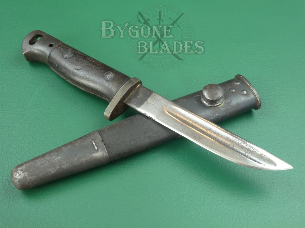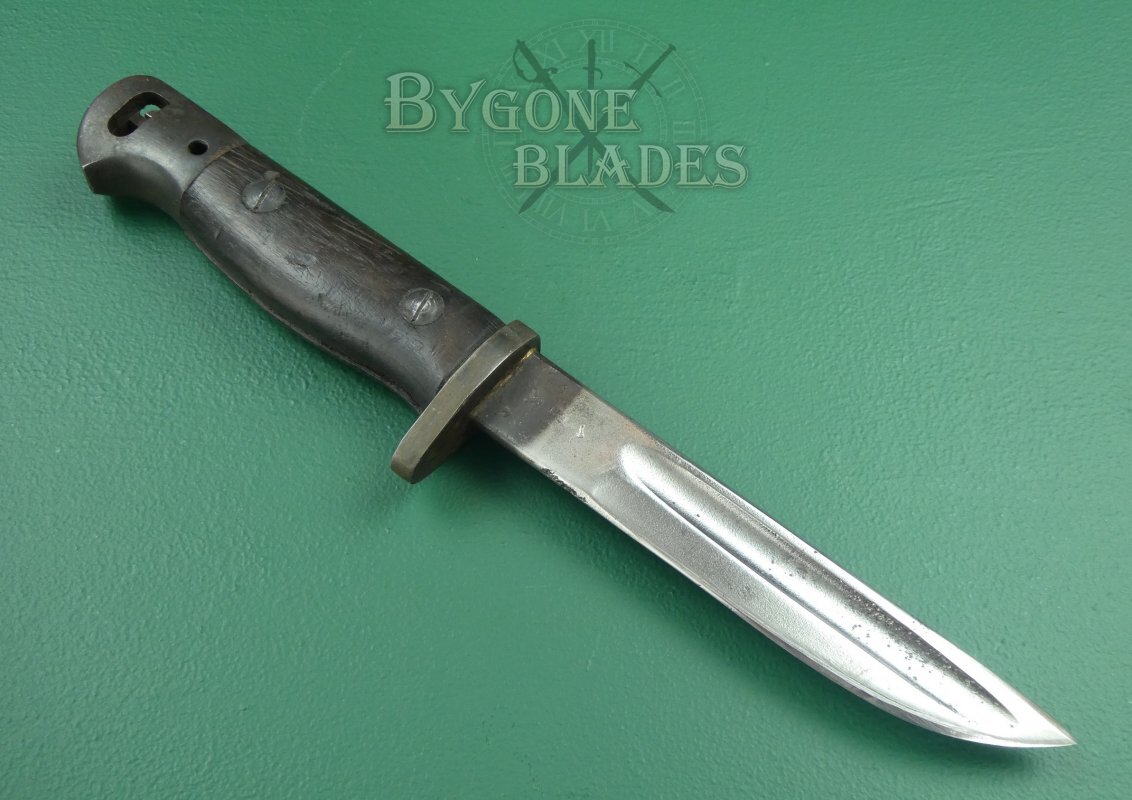 A military fighting knife is a combat knife designed to kill or gravely incapacitate an enemy soldier at close quarters. These knives was developed in response to a need for a close combat weapon for soldiers conducting assaults and raids. The famous Fairbairn Sykes commando knife was more often than not, a private purchase item by soldiers during WW2 but often these weapons were made by the troops themselves from cut down bayonets. Later, company armourers undertook the task of shortening bayonets for use by the troops.