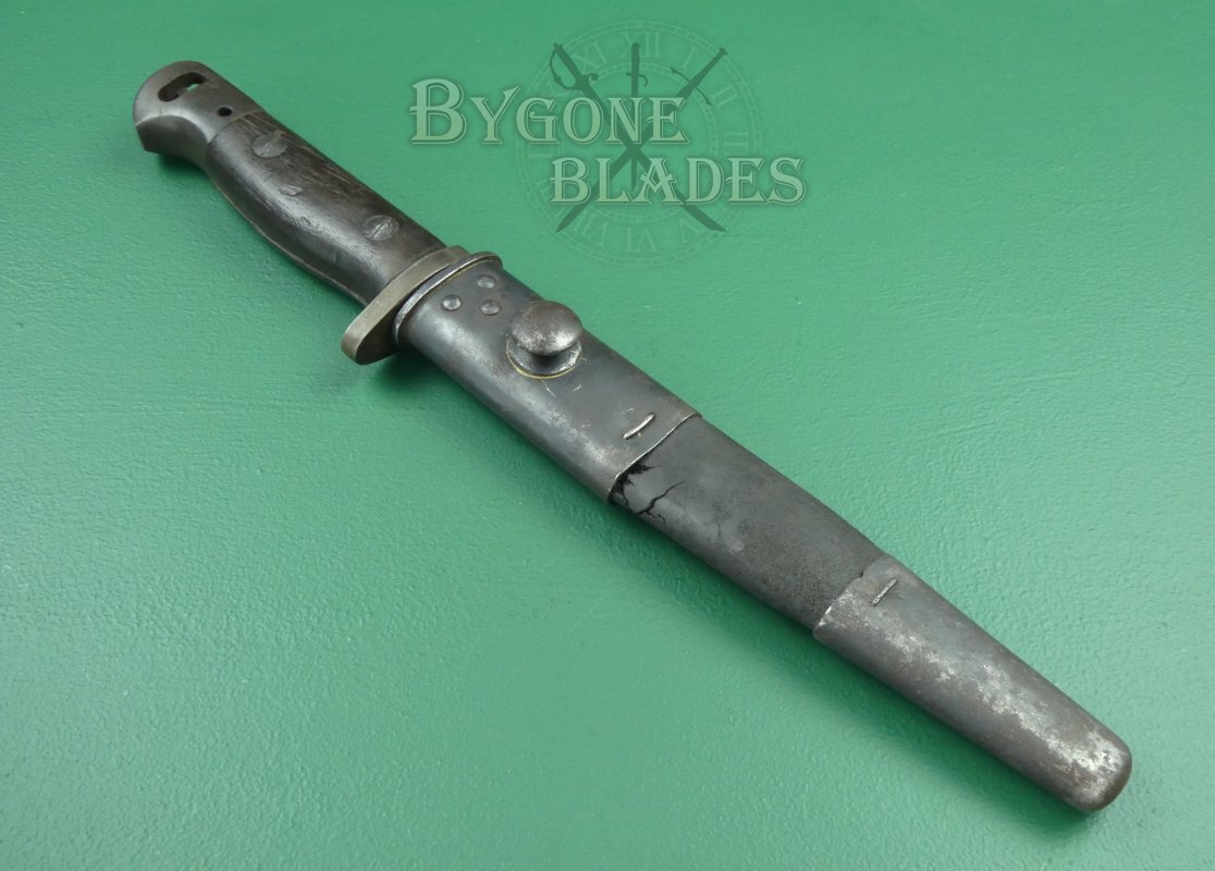 The bayonet’s original scabbard was adapted to accommodate the shortened blade. The scabbard is in fair condition with a tear in the leather below the locket. The stitching of the seam is intact. The throat and chape retain most of their original blueing and the knife sheathes and draws smoothly and is held firmly within the scabbard.