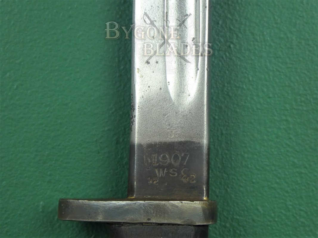 The 144mm blade has a Bowie style point and a sharp single edge. The blade is in fair to good condition with small areas of cleaned shallow pitting and a small patch of deep pitting on the spine. The ricasso bears a faint crowned GR cypher above the pattern date of 1907. The production date of 12 ’42 (December 1942) is stamped below, along with the WSC mark of the Wilkinson Sword Company. The obverse ricasso is stamped with the War Department arrow, an Enfield inspection mark, bend test X and an additional stamp that I am unable to identify.
