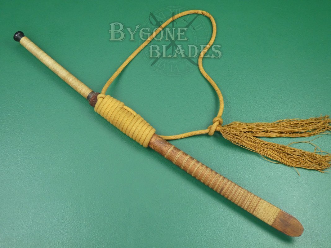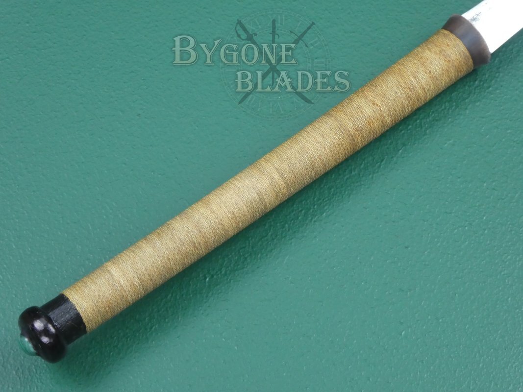 The sword is complete with its wooden scabbard. The scabbard is in good condition and is decorated with bands of woven plant fibre. A faded cord is wrapped around the scabbard and would have been used to “wear” the sword. The sword sheathes and draws smoothly and is held firmly within the scabbard.
