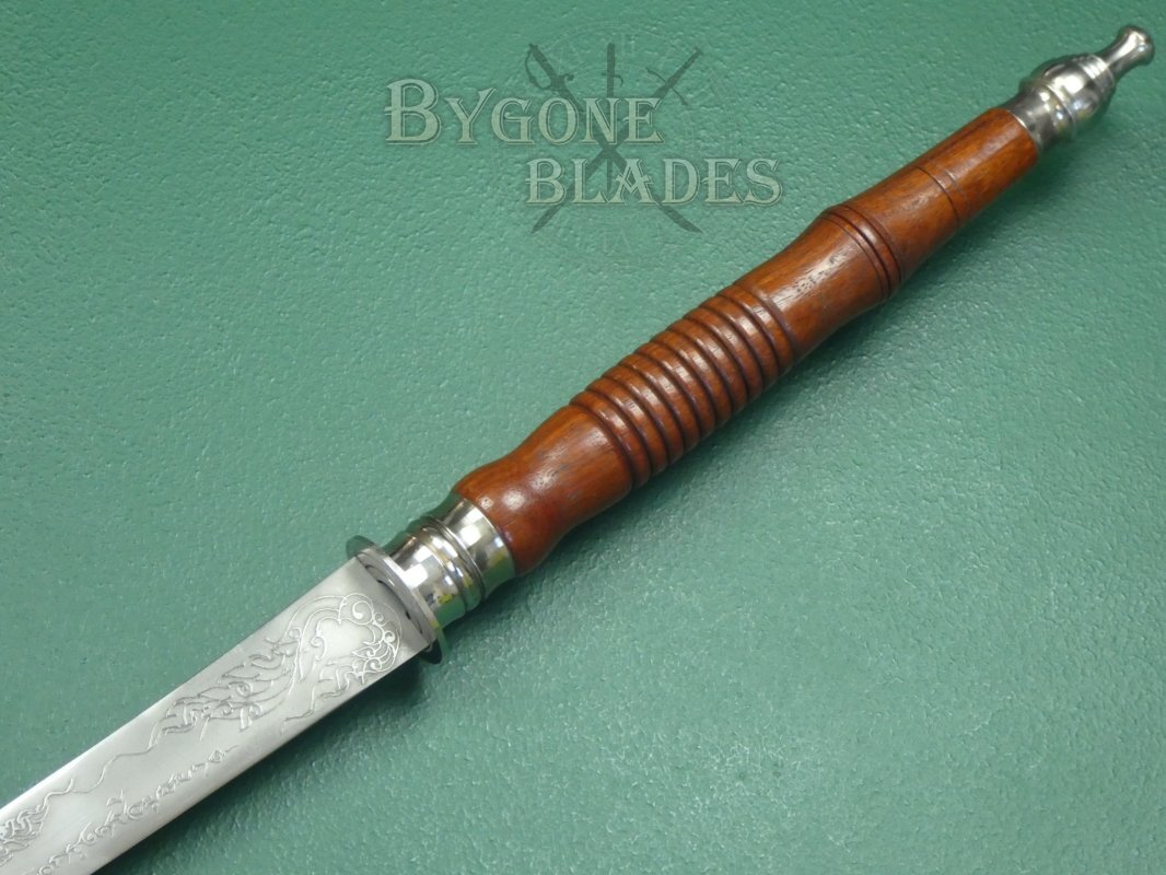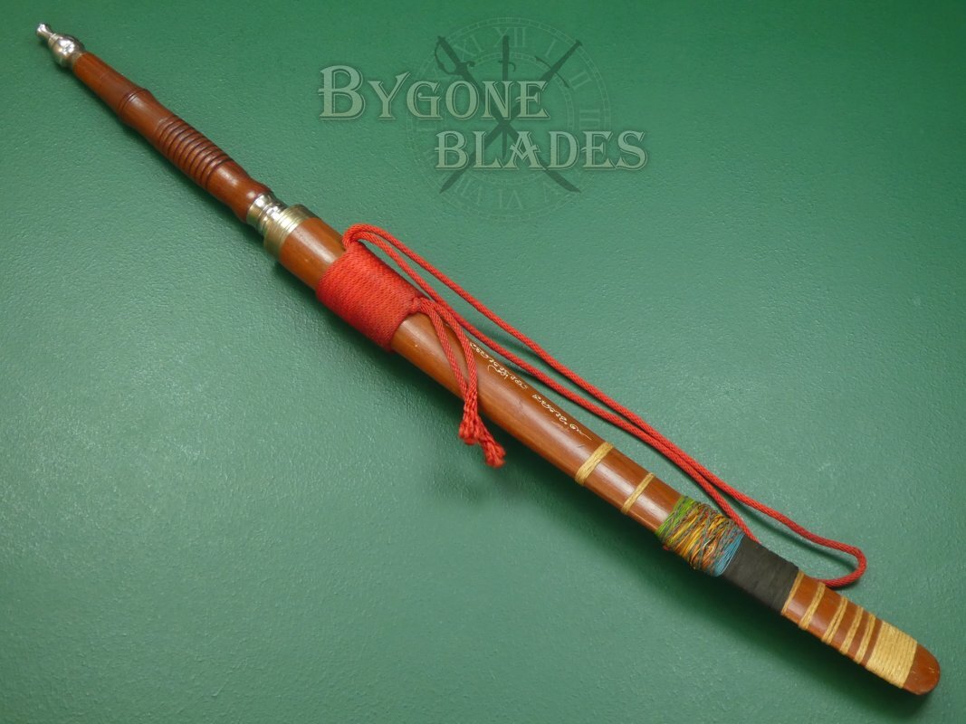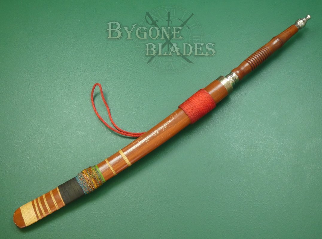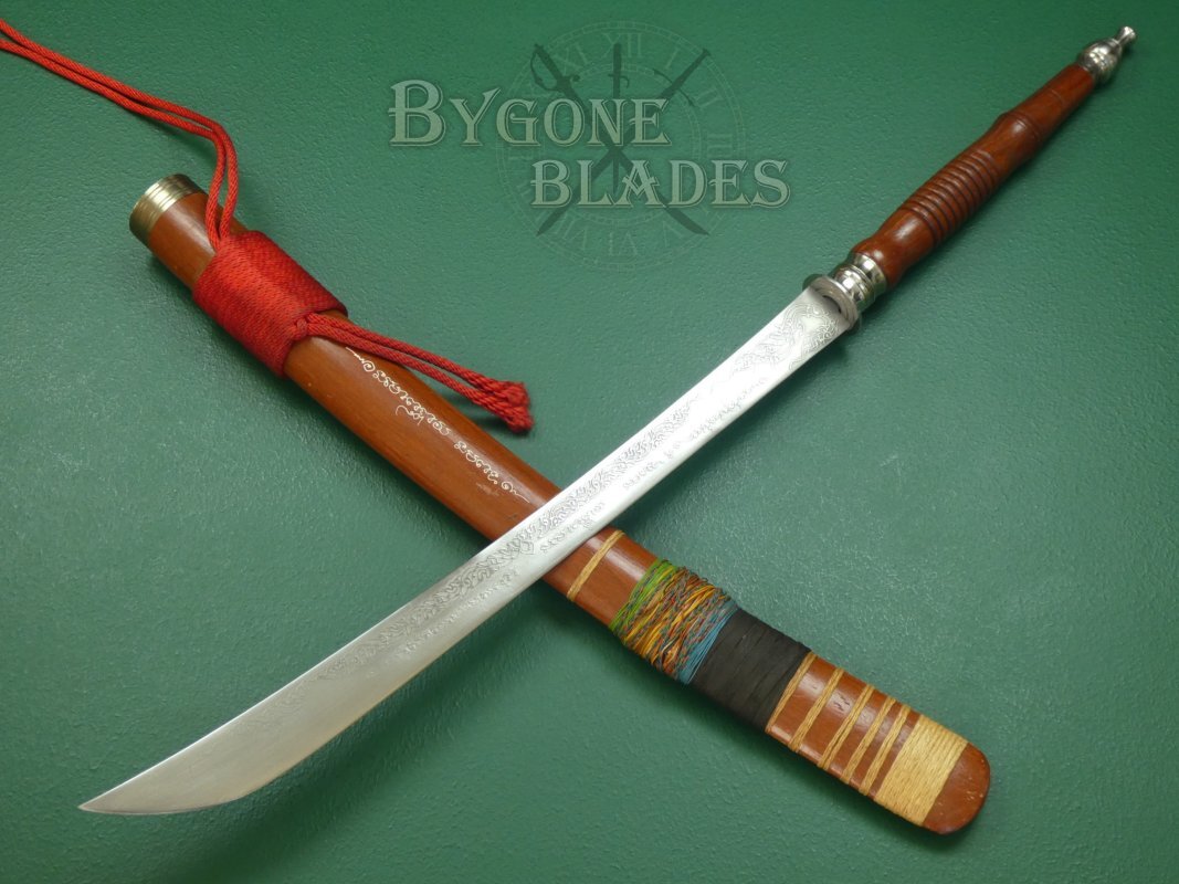 The dha is complete with its wooden scabbard. The scabbard is in good condition and the sword sheathes and draws smoothly and is held firmly within the scabbard.