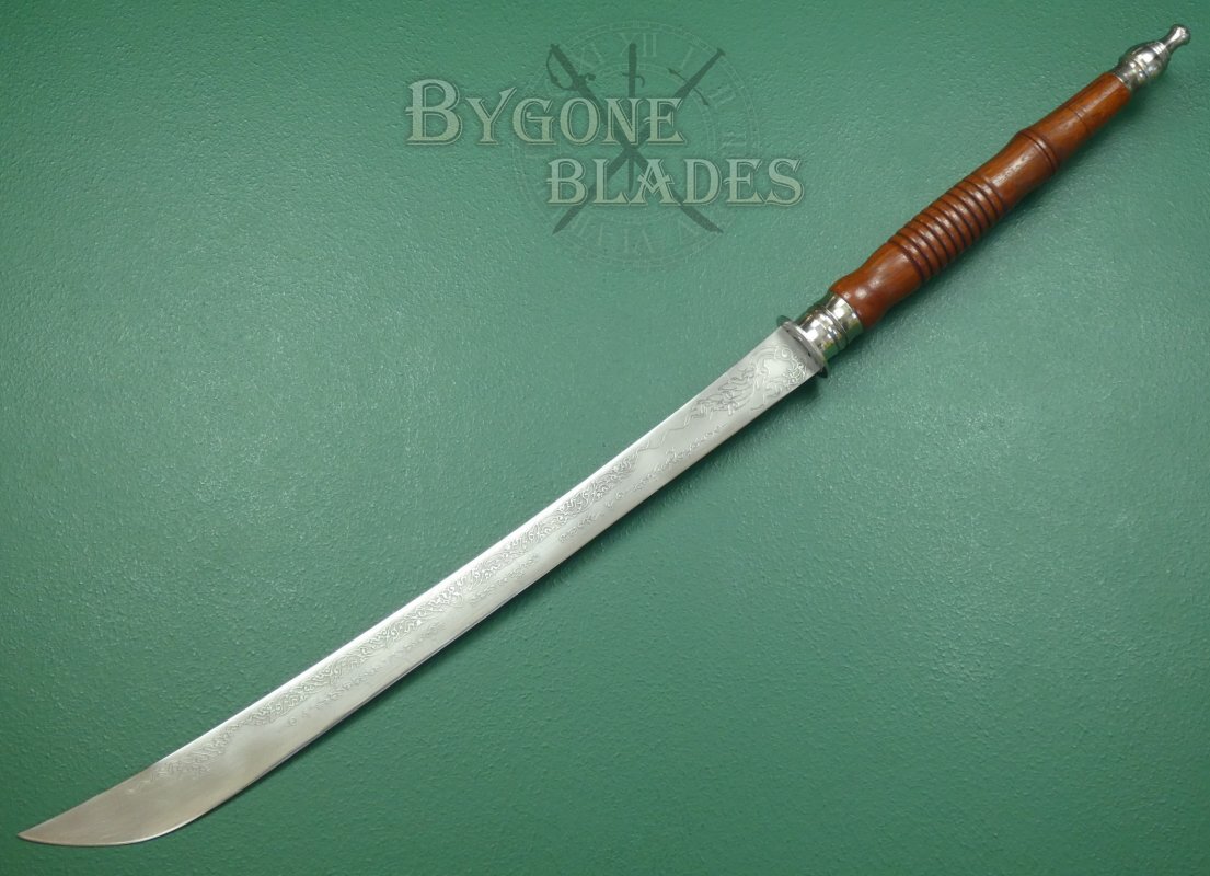 The heavy, 542mm blade has a flat spine tapering to a hatchet point. The blade is 37mm at the base, widening to 42mm before the point. The blade is deeply etched with foliate/vine-like motifs above what looks to be script.
