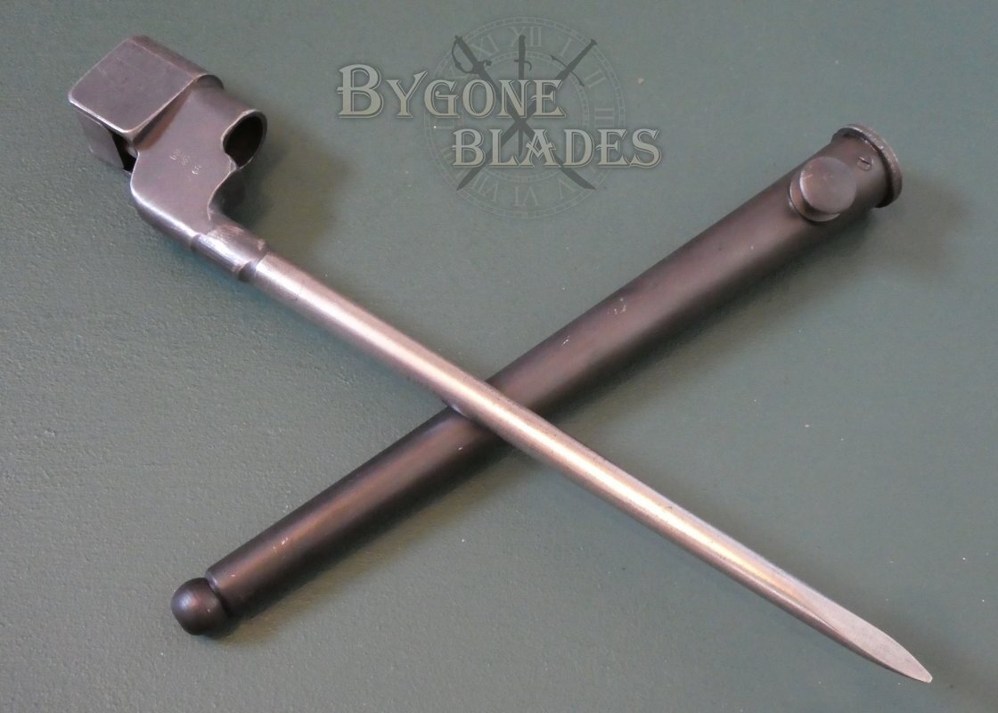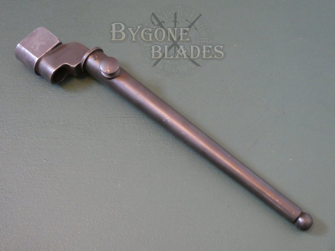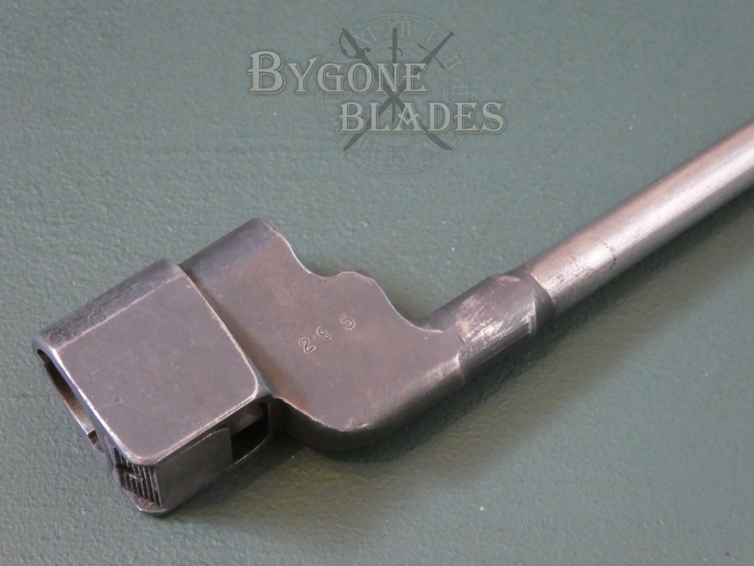 The socket block is stamped with the pattern designation and a partially struck Long Branch maker’s mark. The socket also bears a Canadian Government ownership mark, an arrow within a capital C. The opposite side of the block bears a stamp that I believe corresponds to the rifle it was issued with. The bayonet and scabbard are in great condition and retain their original black finish.