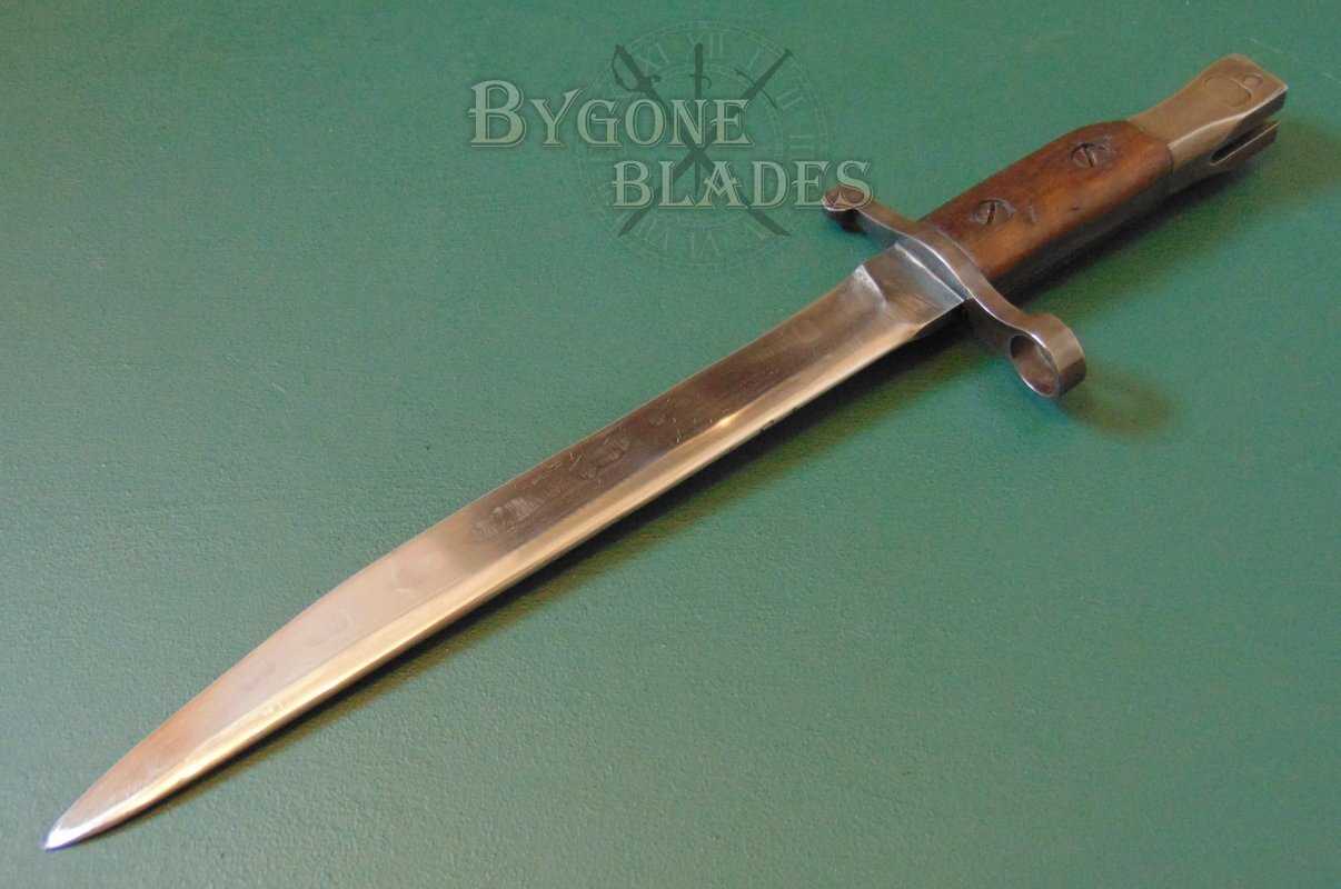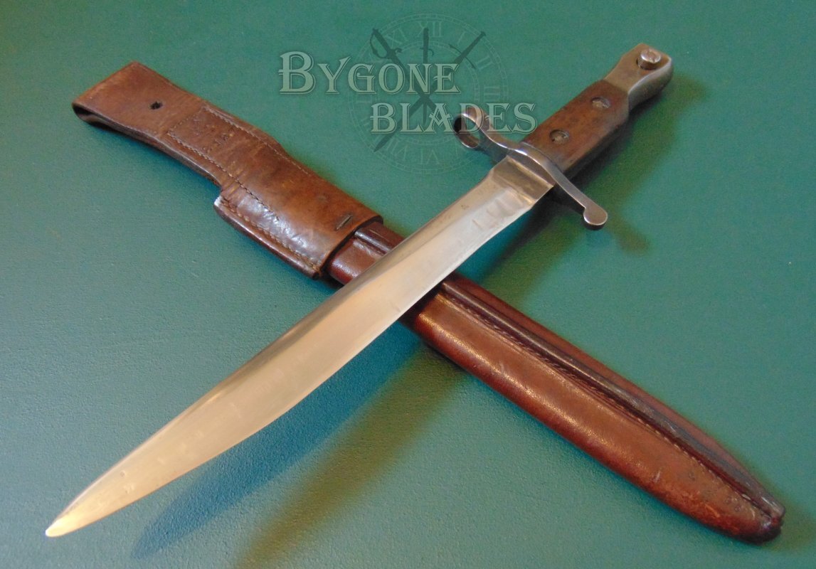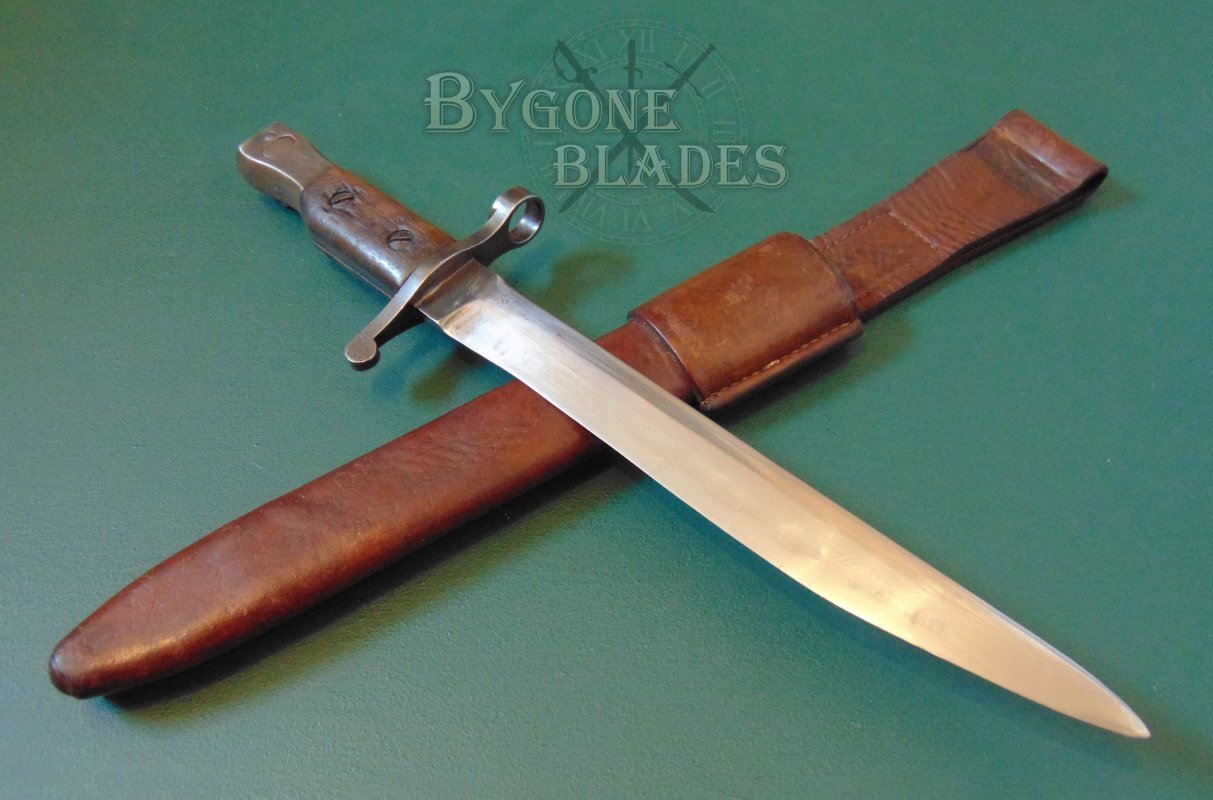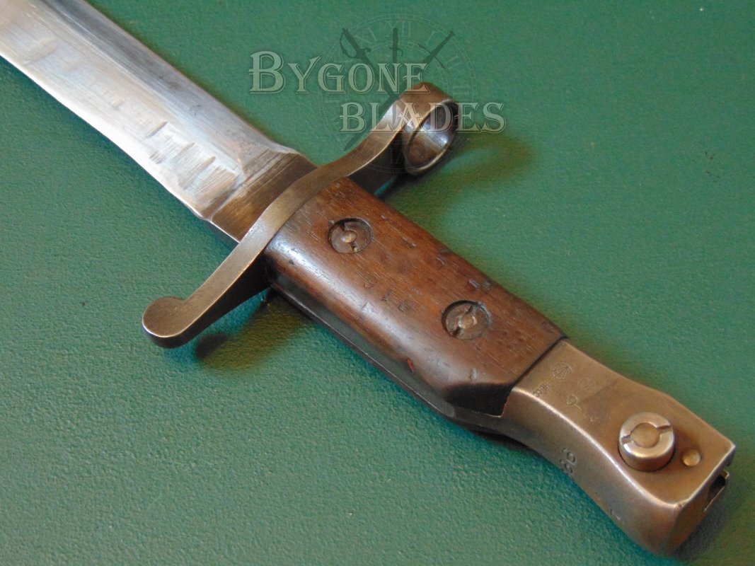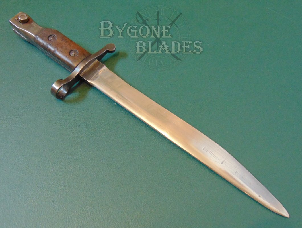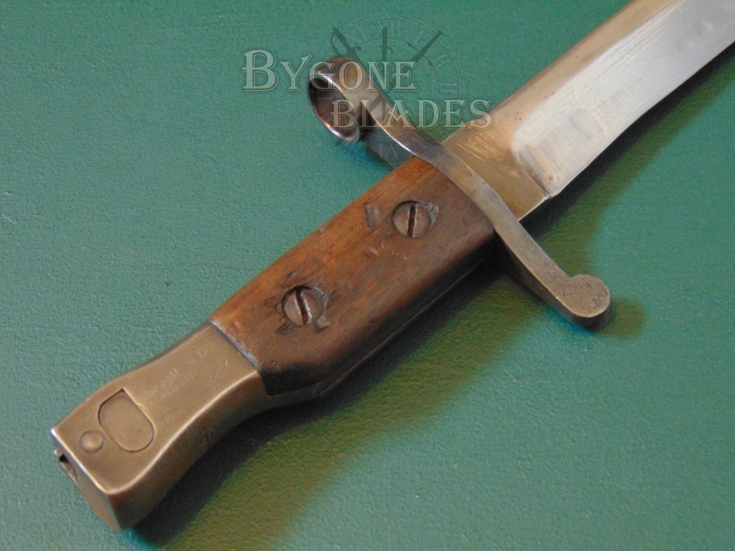 This rare Mk1 Canadian Ross Rifle bayonet was made by the Ross Rifle Company, Quebec in September 1909 and is in good clean condition. The Mk1 bayonet differs from later models by having an extended muzzle ring containing a split spring to aid in securely attaching the bayonet to the muzzle of the rifle. Mk1 Ross bayonets also had a pin through the pommel.