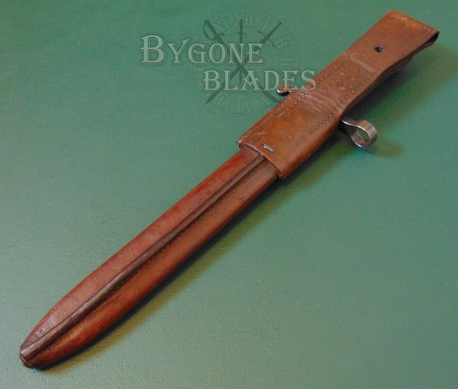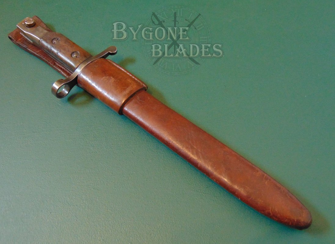The bayonet is complete with its original MkII leather scabbard and stitched on frog. The scabbard is in great condition with minor wear to the leather commensurate with age and use. The stitching is intact and strong. The tip of the scabbard has a steel button. The scabbard bears various markings and Canadian inspection stamps.