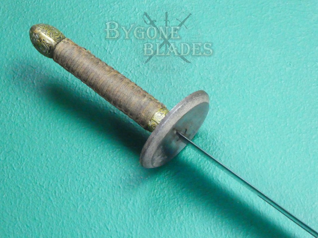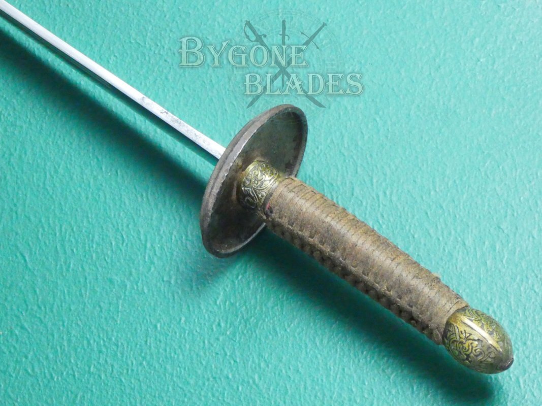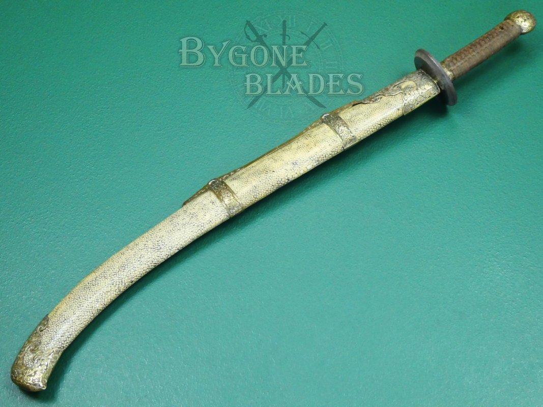 The sword is complete with its shagreen covered wooden scabbard with decorative brass mounts. The scabbard is worn with the curved end pointing down, the sheathed blade being edge-up. The scabbard is in overall very good condition with three small patches of loss to the shagreen along the upper edge. The sword sheathes and draws smoothly and is held firmly within the scabbard.