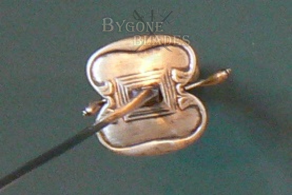 The 724mm double-edged two-phase blade begins as hexagonal form with a flattened medial ridge, becoming lenticular in cross section for the last two thirds of its length. The blade tapers to a needlepoint. The blade is incised on both sides with five “X’s” along the flattened medial ridge. I have seen this mark before on similar 17th Century blades and believe it to be the maker’s mark, the maker who was most probably illiterate, quite literally making a cross to sign his name.